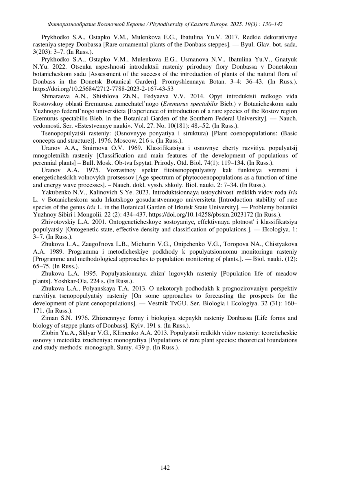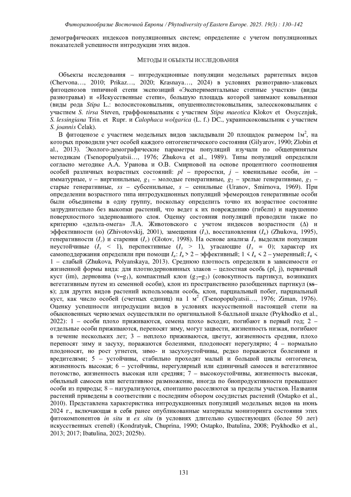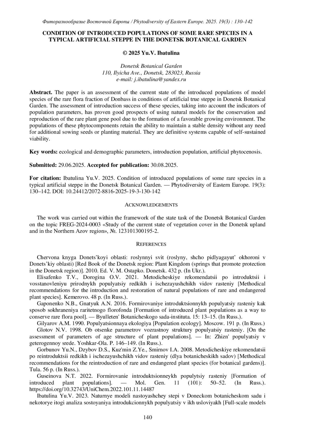 ИБАТУЛИНА Ю.В. СОСТОЯНИЕ ИНТРОДУКЦИОННЫХ ПОПУЛЯЦИЙ НЕКОТОРЫХ РАРИТЕТНЫХ ВИДОВ В УСЛОВИЯХ ТИПИЧНОЙ ИСКУССТВЕННОЙ СТЕПИ В ДОНЕЦКОМ БОТАНИЧЕСКОМ САДУ // ФИТОРАЗНООБРАЗИЕ ВОСТОЧНОЙ ЕВРОПЫ. 2025. Т. 19 № 3