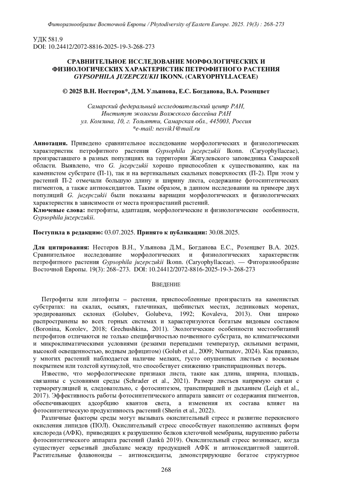 3. Bogdanova E., Sablina N., Vasjukov V., Rozentsvet O. 2025b. Functional characteristics of leaves of the calcicole Gypsophila volgensis change along a geographic gradient. - Flora. 330: 152787. DOI: 10.1016/j.flora.2025.15278