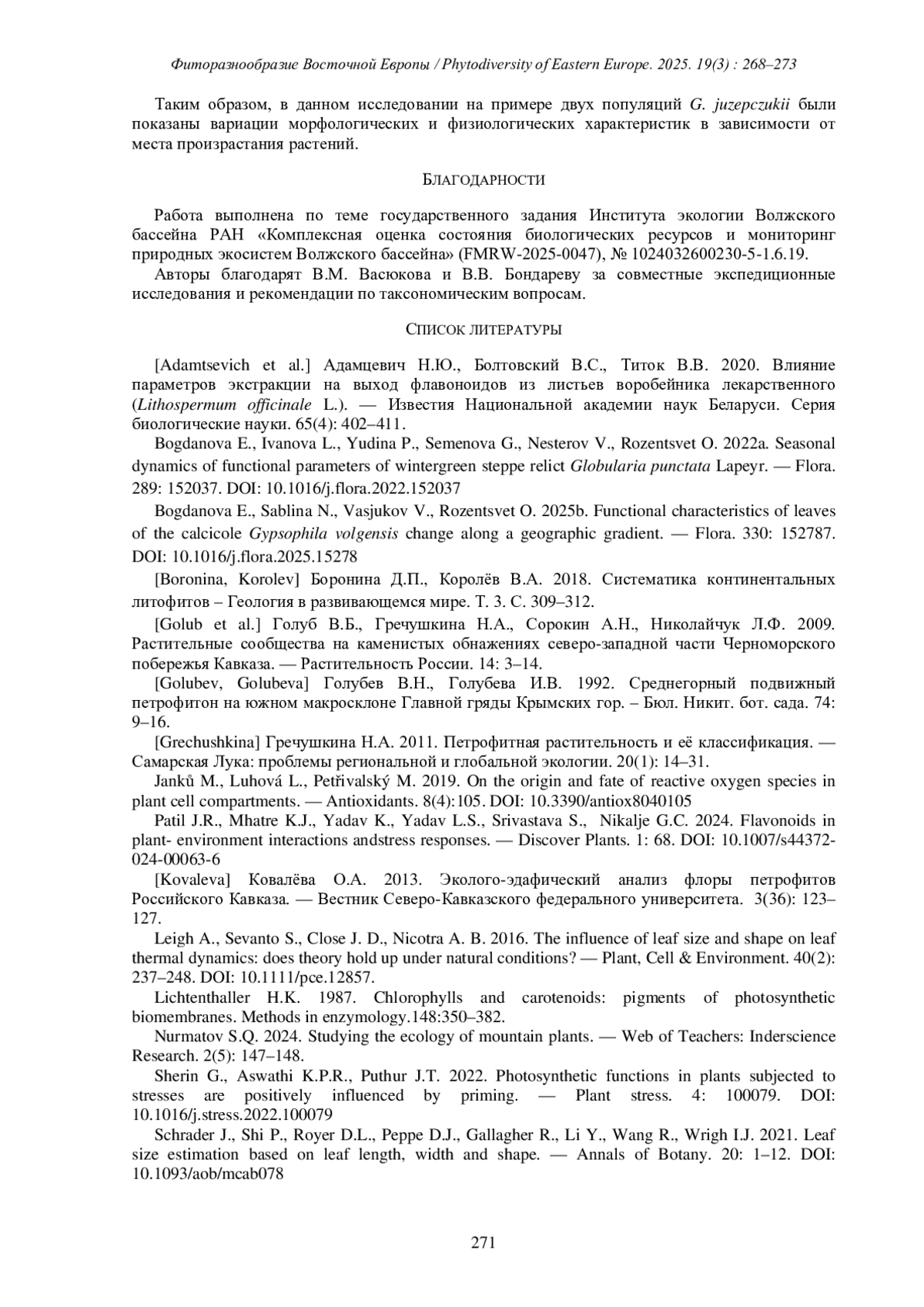 2. Bogdanova E., Ivanova L., Yudina P., Semenova G., Nesterov V., Rozentsvet O. 2022a. Seasonal dynamics of functional parameters of wintergreen steppe relict Globularia punctata Lapeyr. - Flora. 289: 152037. DOI: 10.1016/j.flora.2022.152037