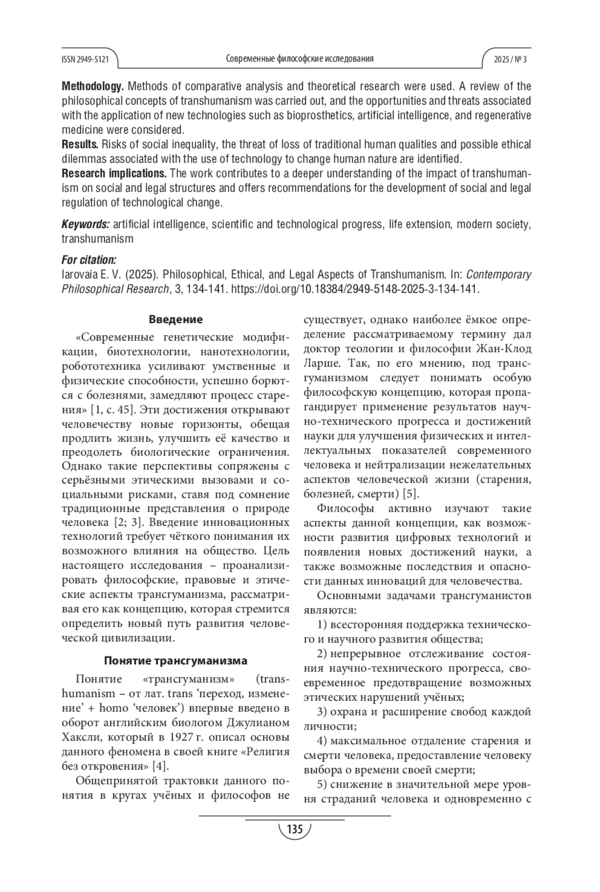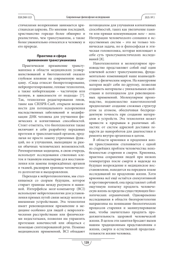 Цель. Анализ философских, правовых и этических аспектов трансгуманизма, исследование его влияния на человеческую природу и социальные процессы в контексте внедрения новых технологий, таких как генетические модификации, нанотехнологии и нейротехнологии.