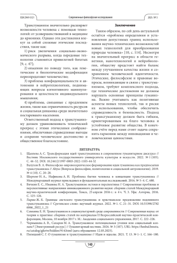 Результаты. Выявлены риски социального неравенства, угроза утраты традиционных человеческих качеств и возможные этические дилеммы, связанные с использованием технологий для изменения природы человека.
