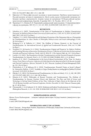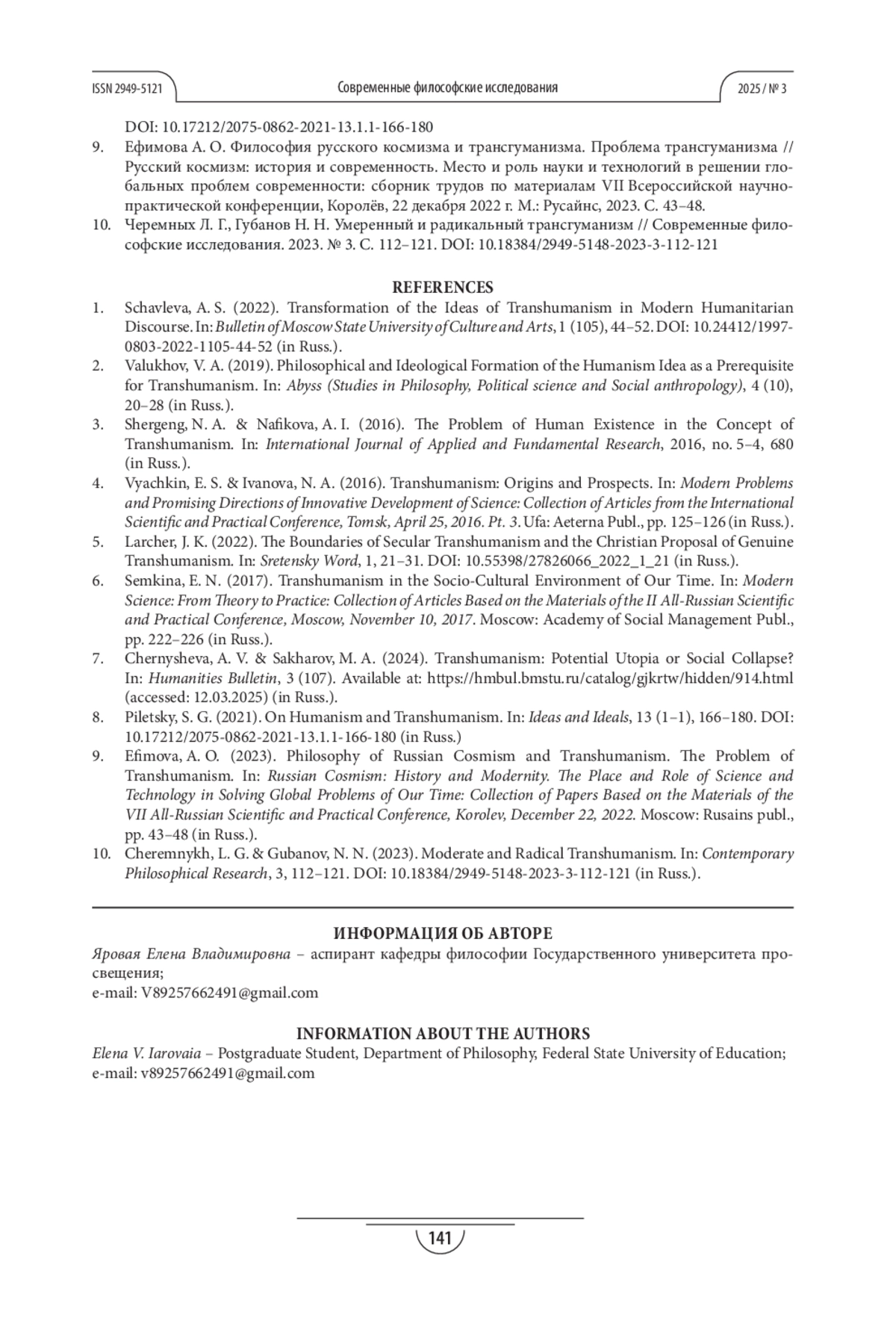 9. Ефимова А. О. Философия русского космизма и трансгуманизма. Проблема трансгуманизма // Русский космизм: история и современность. Место и роль науки и технологий в решении глобальных проблем современности: сборник трудов по материалам VII Всероссийской научно-практической конференции, Королёв, 22 декабря 2022 г. М.: Русайнс, 2023. С. 43-48.
