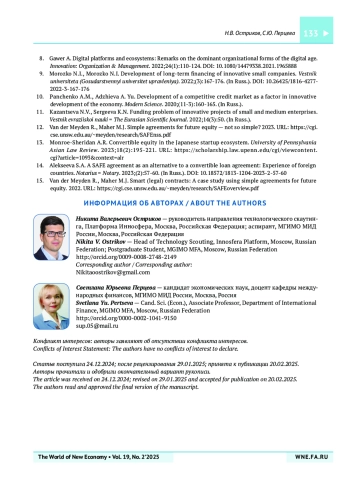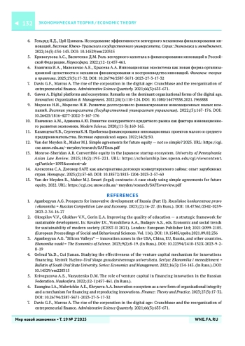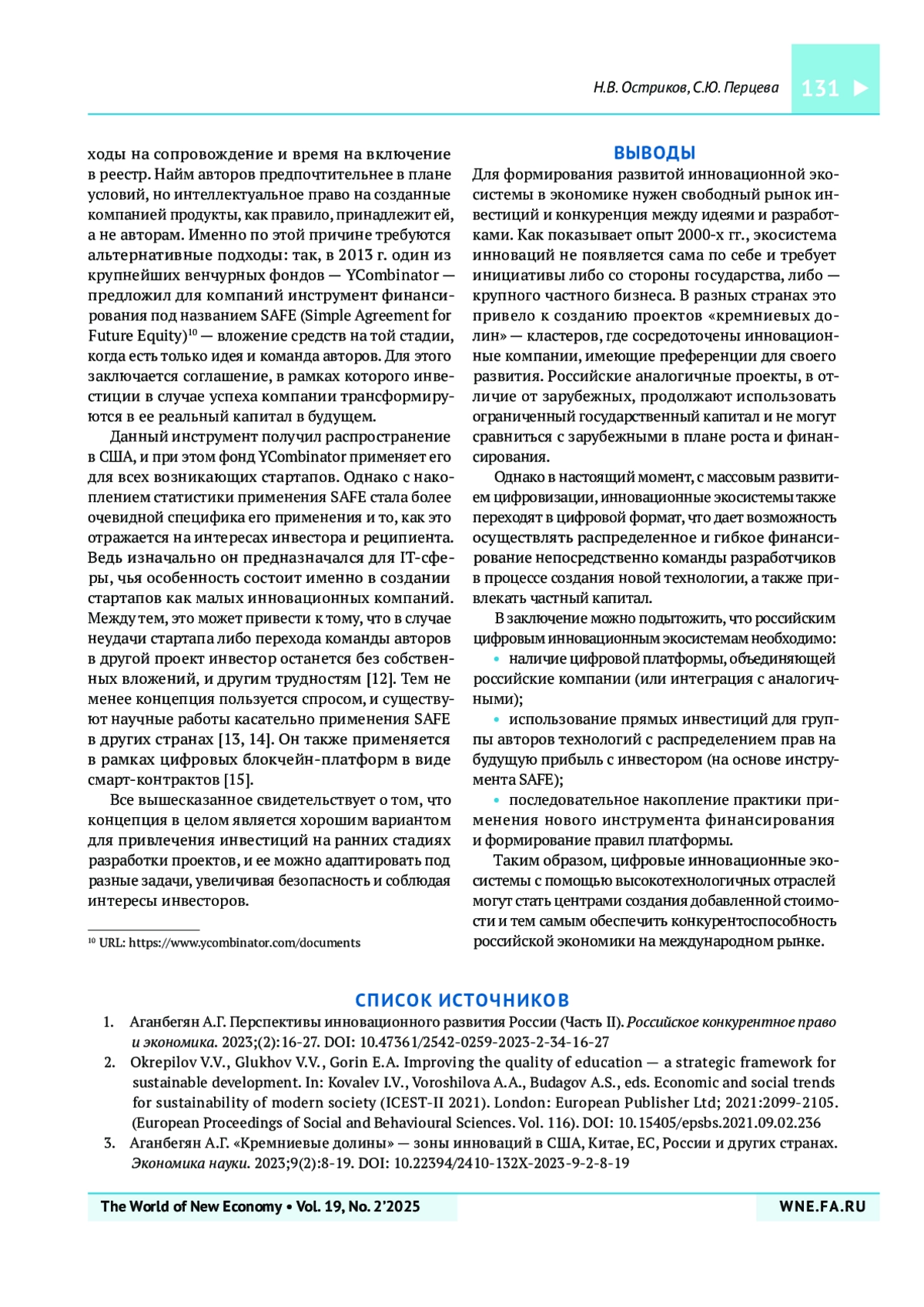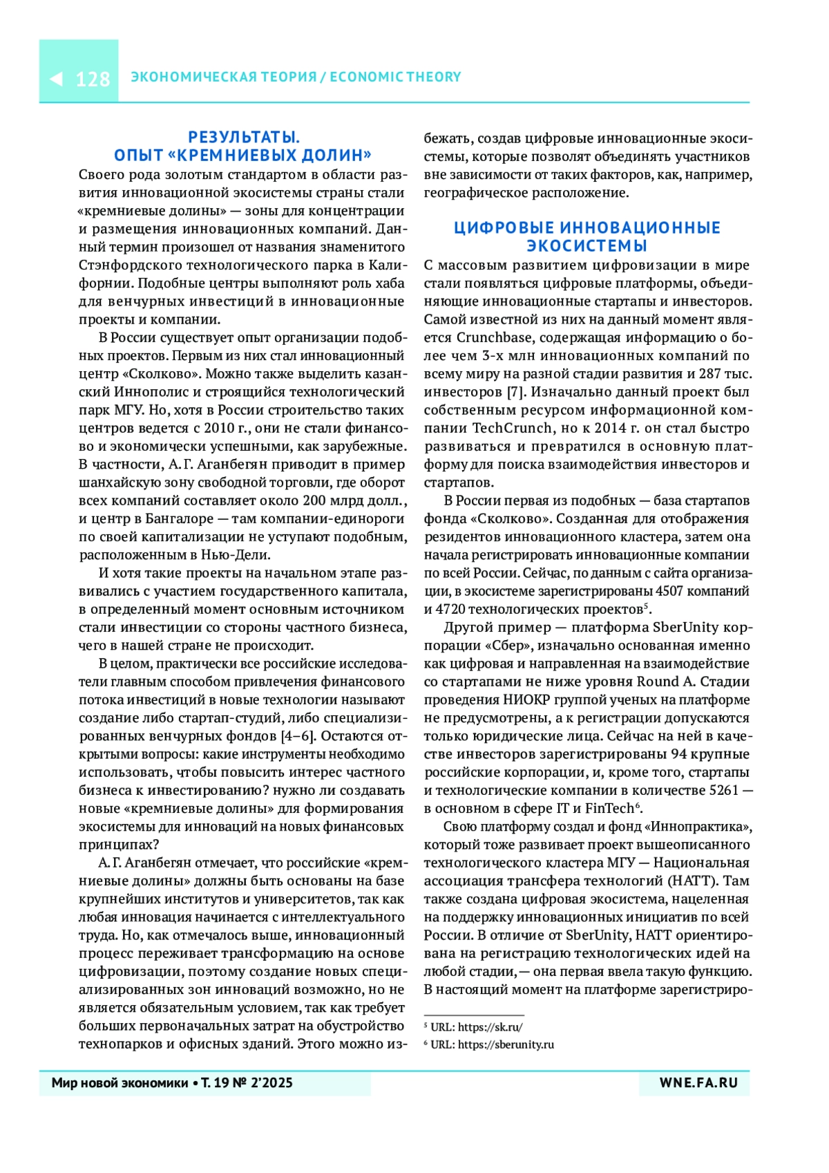 6. Езангина И.А., Маловичко А.Е., Хрысева А.А. Инновационная экосистема как новая форма организационной целостности и механизм финансирования и воспроизводства инноваций. Финансы: теория и практика. 2023;27(3):17-32. https://doi.org/10.26794/2587-5671-2023-27-3-17-32