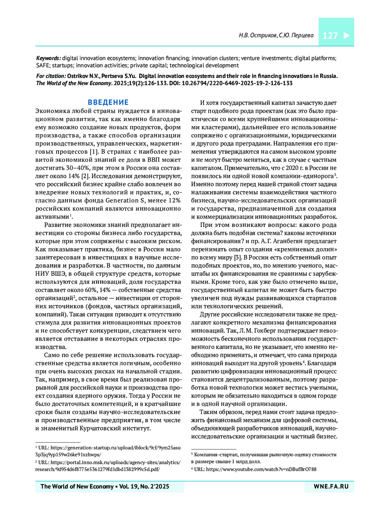 Цель. В статье рассматривается роль цифровых инновационных экосистем как ключевого фактора в развитии современной системы финансирования инноваций в России. Методы. Исследование проводилось при помощи анализа источников литературы и сравнительного анализа. Результаты. Авторами проведен комплексный анализ международного и отечественного опыта создания и функционирования инновационных кластеров типа «кремниевых долин», а также исследованы современные цифровые платформы для эффективного взаимодействия инвесторов и инновационных проектов. На основе системного подхода выявлены особенности и ограничения существующих инструментов финансирования инноваций, обоснована необходимость внедрения альтернативных механизмов привлечения частного капитала в инновационную сферу. Предложены практические рекомендации по развитию российских цифровых инновационных экосистем. Научная новизна. В исследовании применен комплексный подход к изучению роли цифровых инновационных экосистем в финансировании инноваций в России, включая использование опыта международных «инновационных долин» и современных цифровых платформ для привлечения инвестиций. Практическая значимость. Представленные результаты могут быть использованы при разработке государственной политики в области инновационного развития и цифровой трансформации экономики.