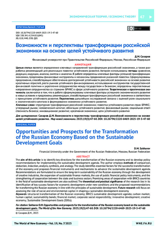 Автором использованы методы сравнения, дедукции, индукции, анализа, синтеза и аналогии. В работе определены ключевые факторы успешной трансформации экономики, предложены финансовые инструменты и механизмы продвижения указанной повестки. Сформулированы предложения, способствующие обеспечению долгосрочной устойчивости российской экономики на основе развития креативных отраслей, роста рынков устойчивого финансирования, использования инструментов государственной финансовой политики и укрепления сотрудничества между государством и бизнесом; определены перспективные направления сотрудничества со странами БРИКС в сфере устойчивого развития.