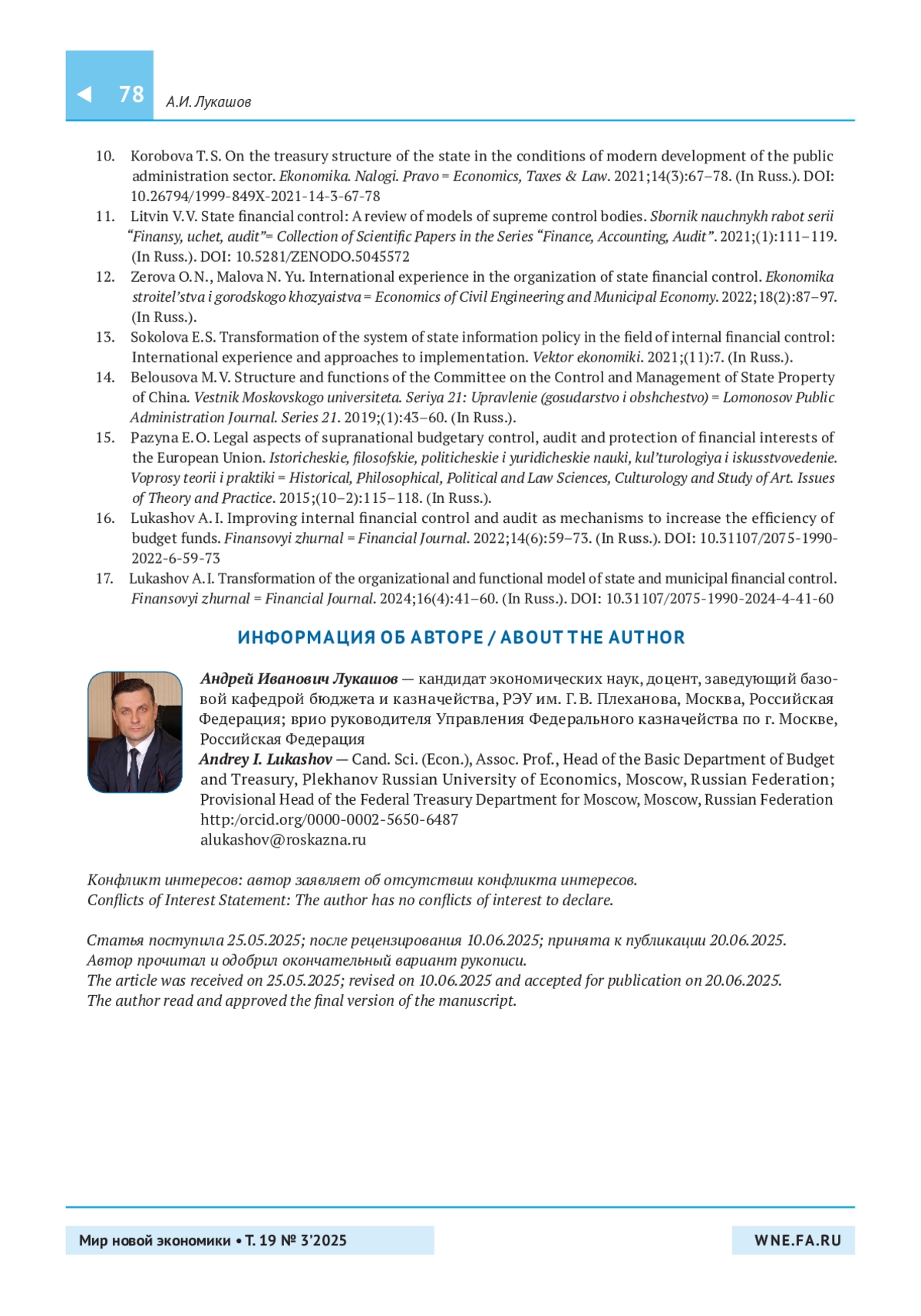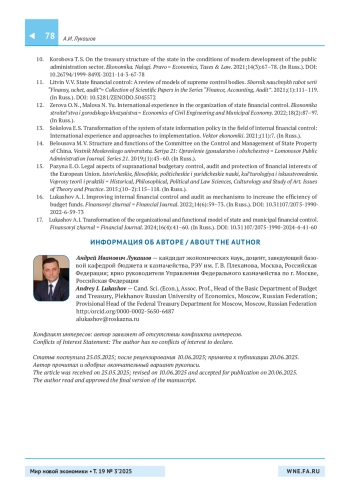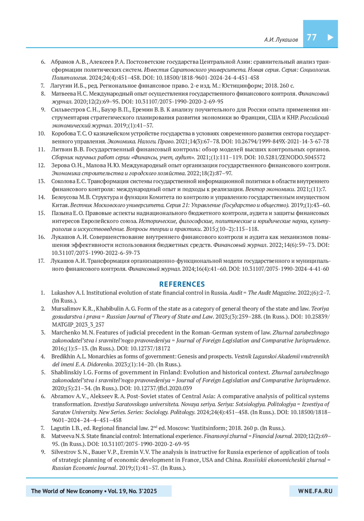 1. Лукашов А.И., Институциональная эволюция государственного финансового контроля в России. Аудит. 2022;(6):2-7.