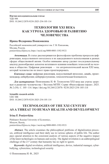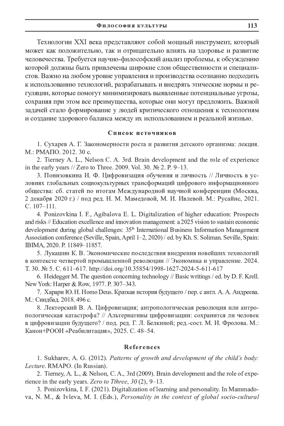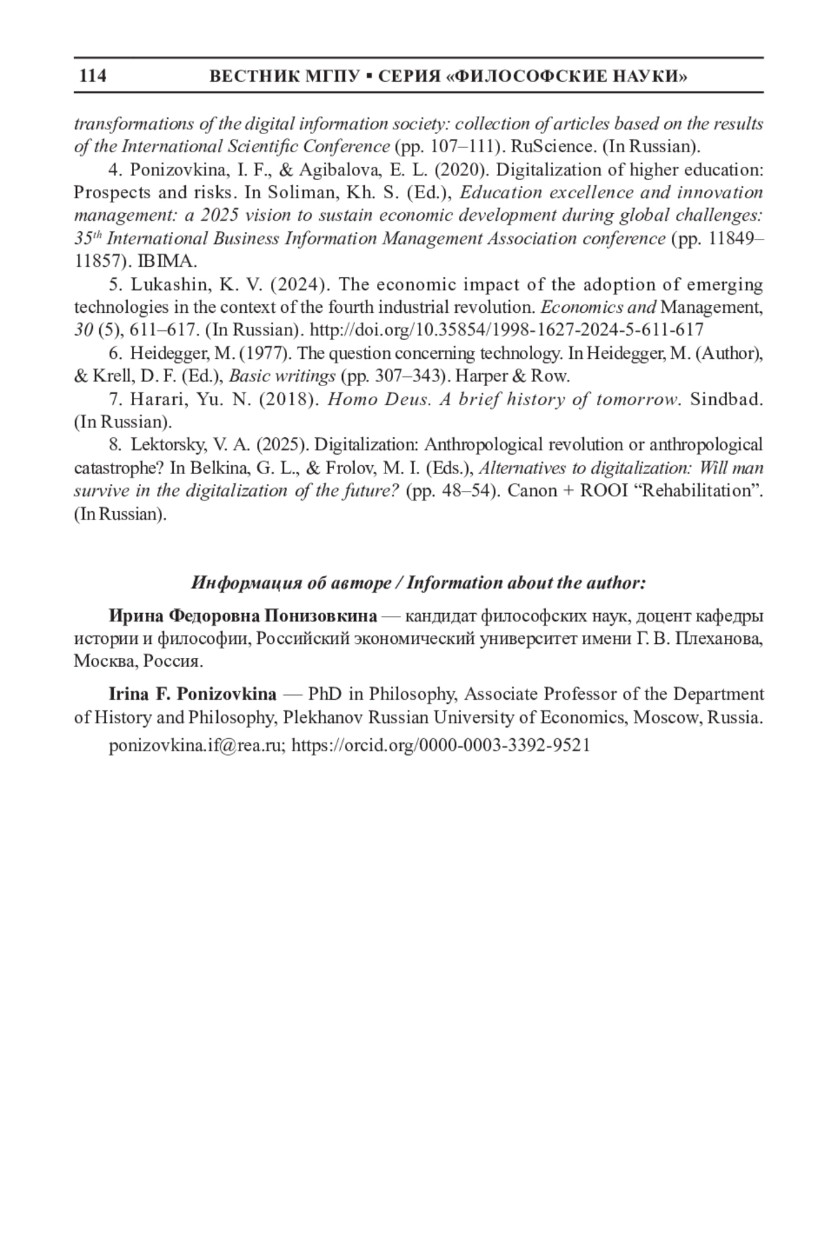 4. Ponizovkina I. F., Agibalova E. L. Digitalization of higher education: Prospects and risks // Education excellence and innovation management: a 2025 vision to sustain economic development during global challenges: 35th International Business Information Management Association conference (Seville, Spain, April 1-2, 2020) / ed. by Kh. S. Soliman. Seville, Spain: IBIMA, 2020. P. 11849-11857.