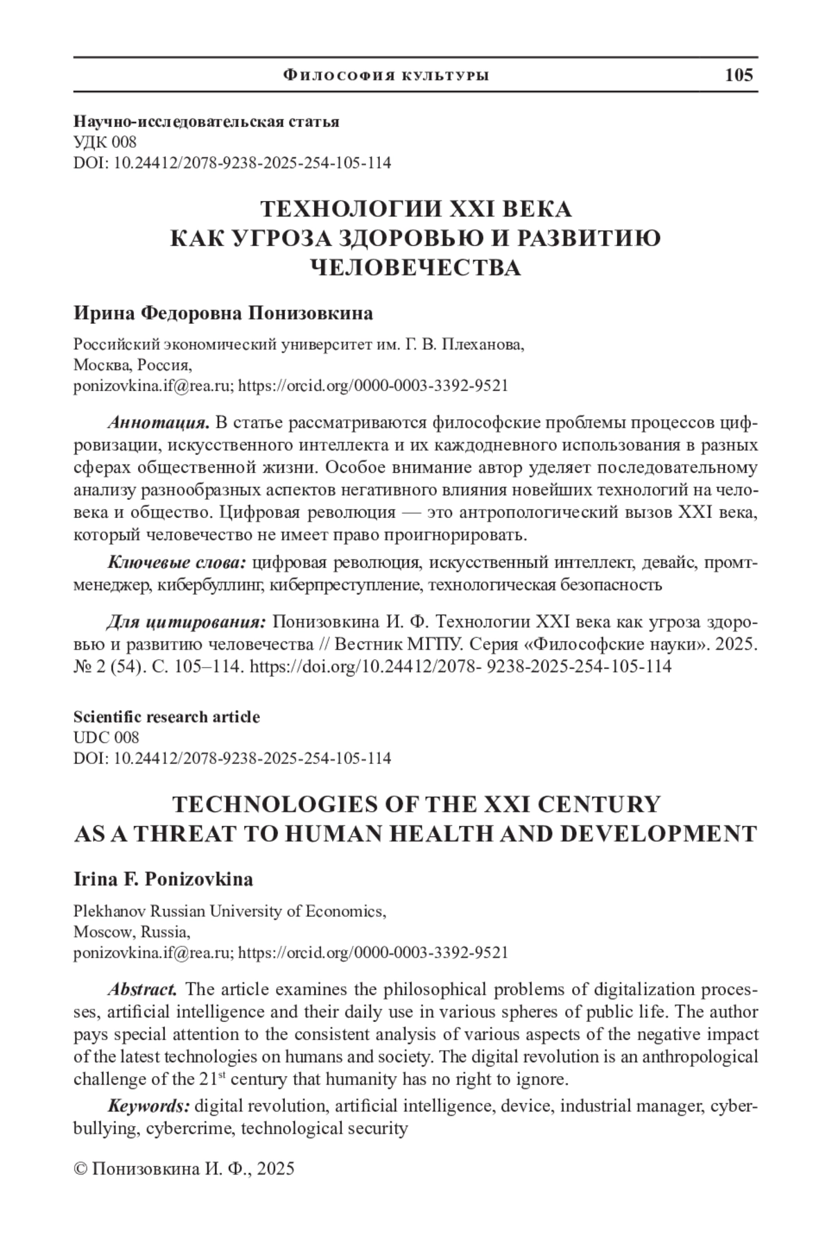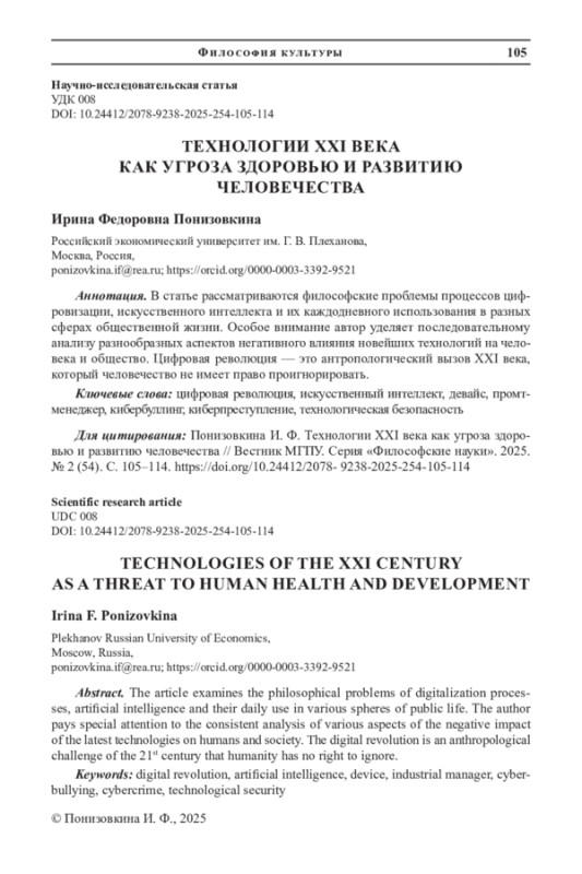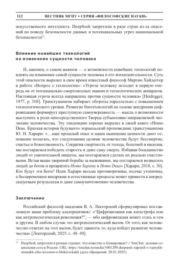 8. Лекторский В. А. Цифровизация; антропологическая революция или антропологическая катастрофа? // Альтернативы цифровизации: сохранится ли человек в цифровизации будущего? / под. ред. Г. Л. Белкиной; ред.-сост. М. И. Фролова. М.: Канон+РООИ “Реабилитация”, 2025. С. 48-54.
