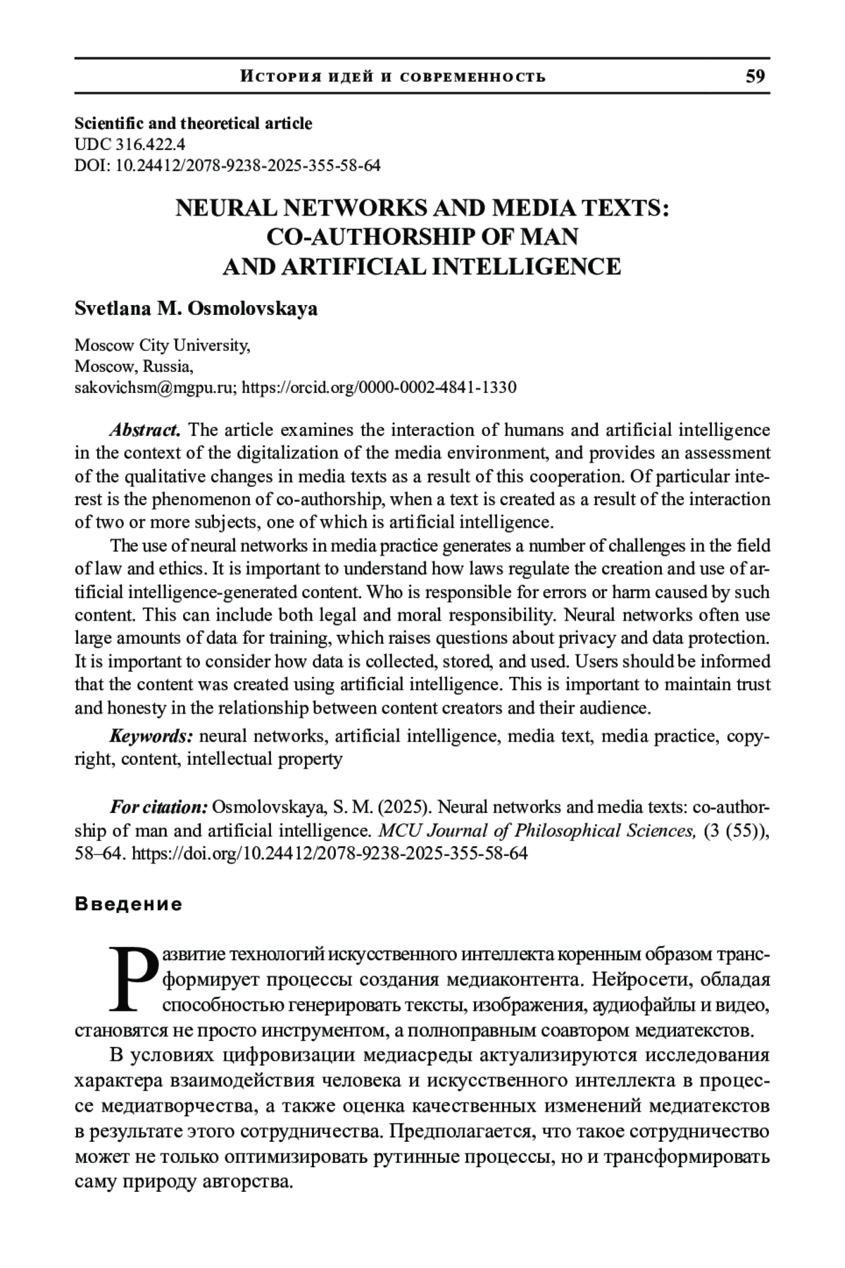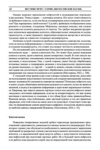 1. Крашенинникова М. А., Кульчицкая Д. Ю., Лукина М. М., Замков А. В. Искусственный интеллект в российских медиа и журналистике: к дискуссии об этической кодификации // Вопросы теории и практики журналистики. 2022. Т. 11. № 4. С. 680-694. EDN: WMNHIF