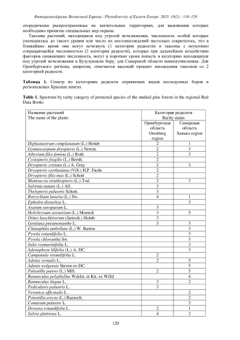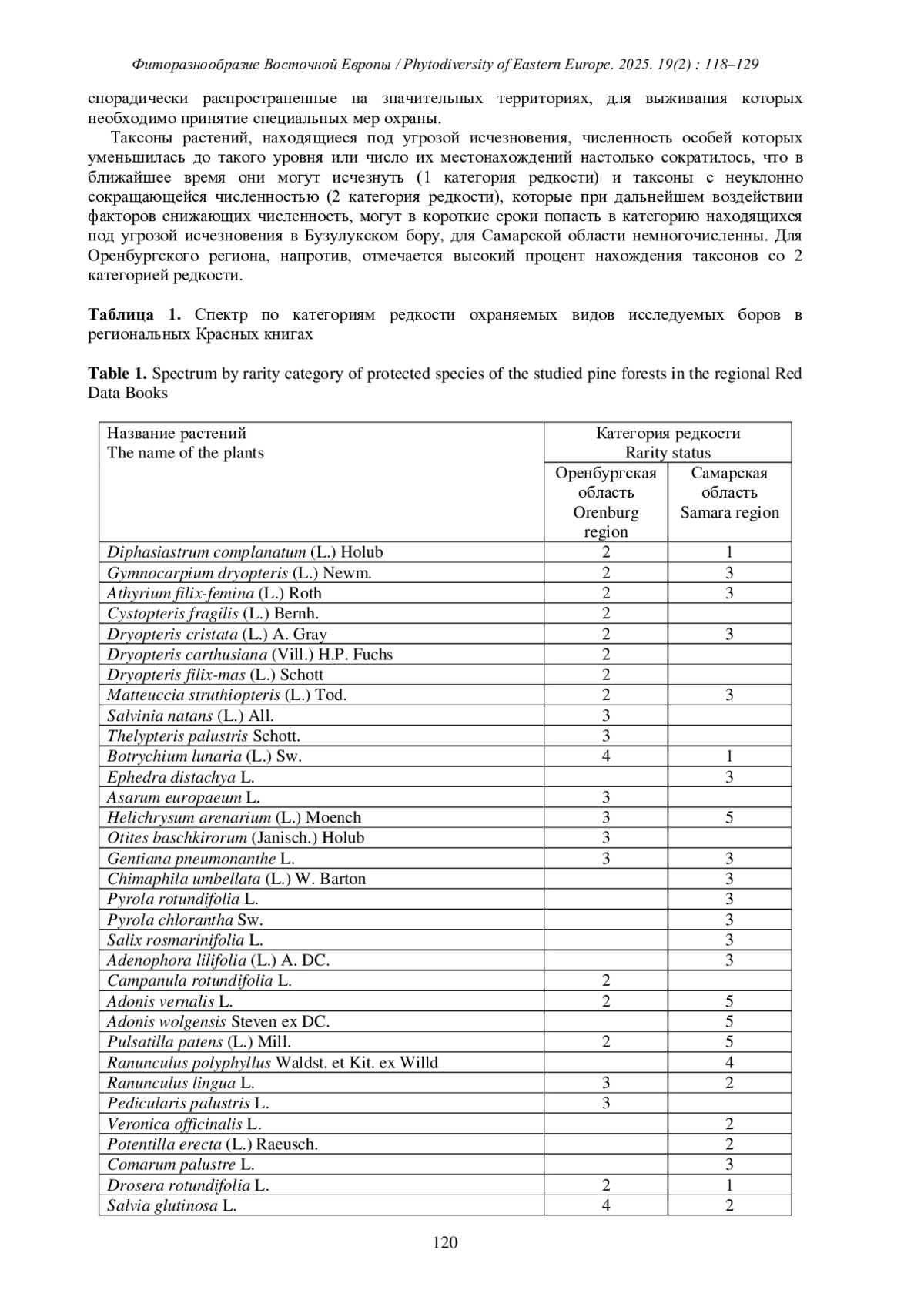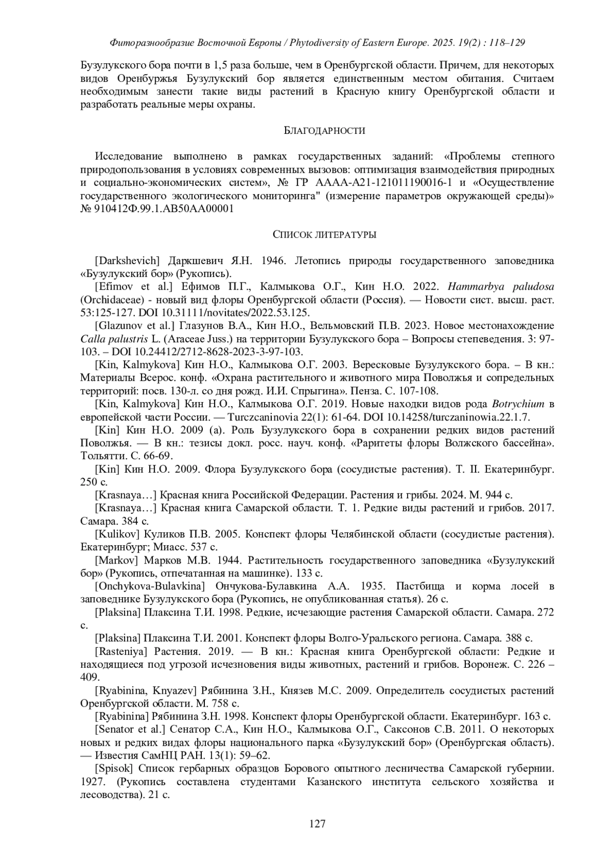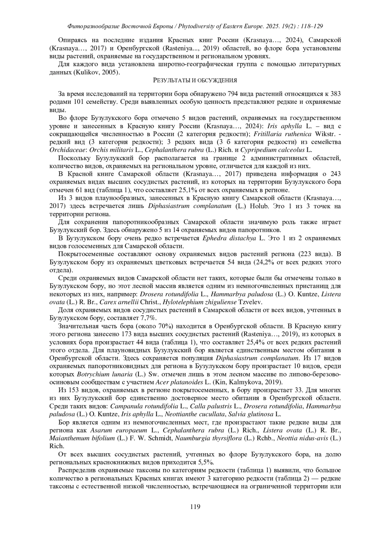 КИН Н. О. СПЕКТР РЕДКИХ И ОХРАНЯЕМЫХ РАСТЕНИЙ САМАРСКОГО И ОРЕНБУРГСКОГО РЕГИОНОВ В УСЛОВИЯХ БУЗУЛУКСКОГО БОРА // ФИТОРАЗНООБРАЗИЕ ВОСТОЧНОЙ ЕВРОПЫ. 2025. Т. 19 № 2