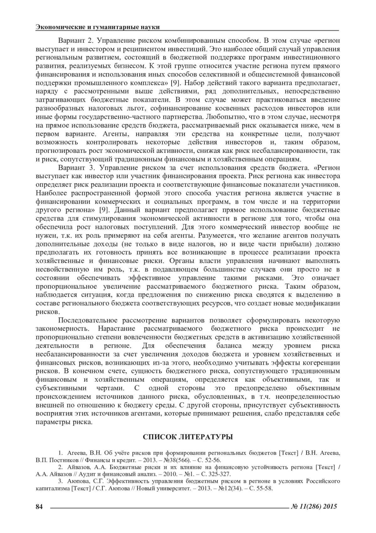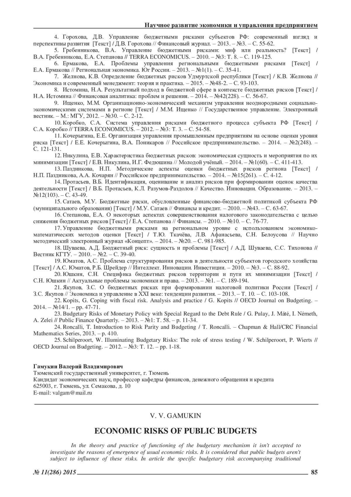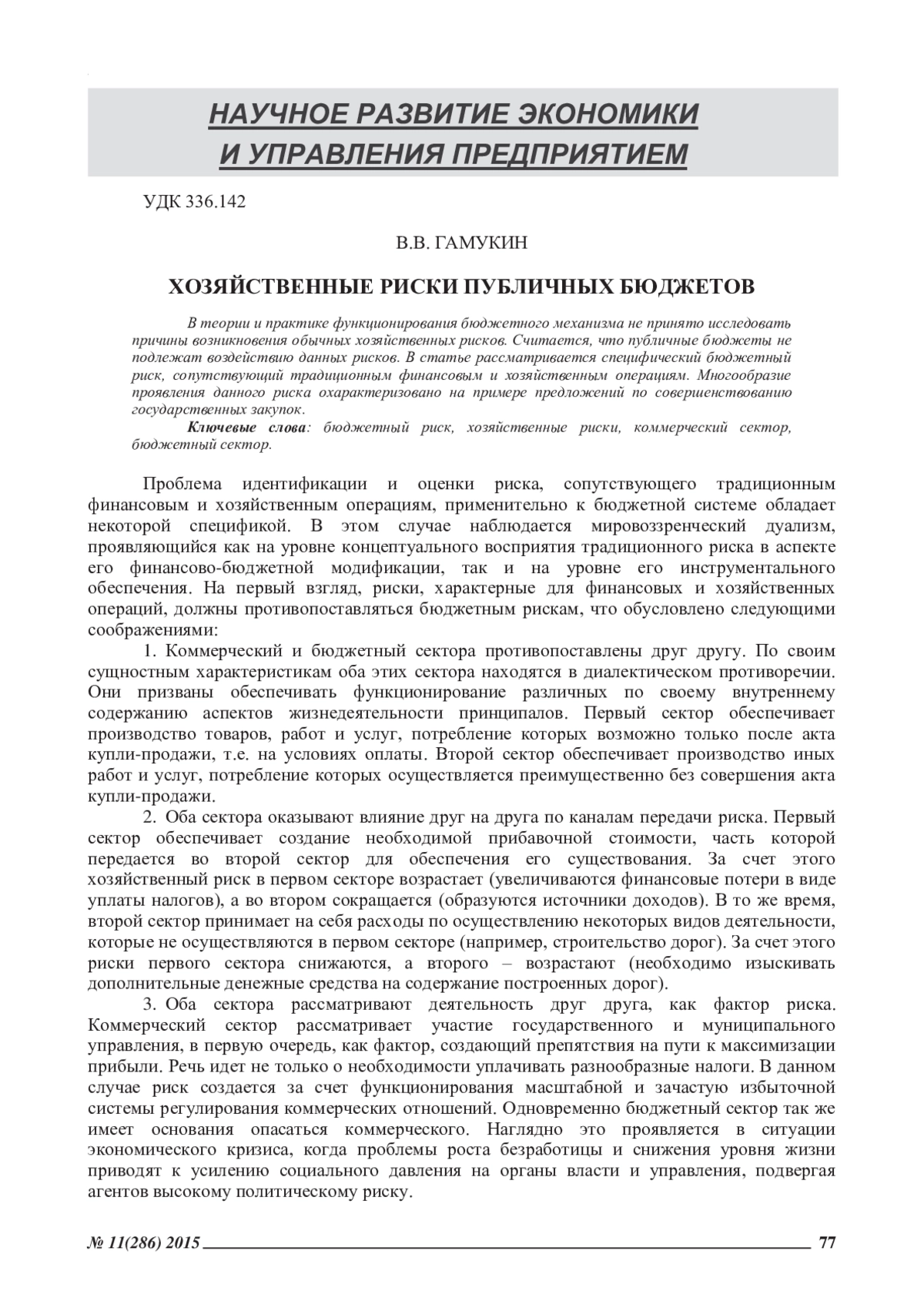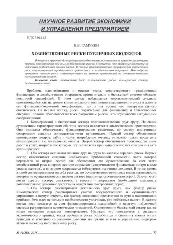 ГАМУКИН В. В. ХОЗЯЙСТВЕННЫЕ РИСКИ ПУБЛИЧНЫХ БЮДЖЕТОВ // ЭКОНОМИЧЕСКИЕ И ГУМАНИТАРНЫЕ НАУКИ. 2015. № 11 (286)