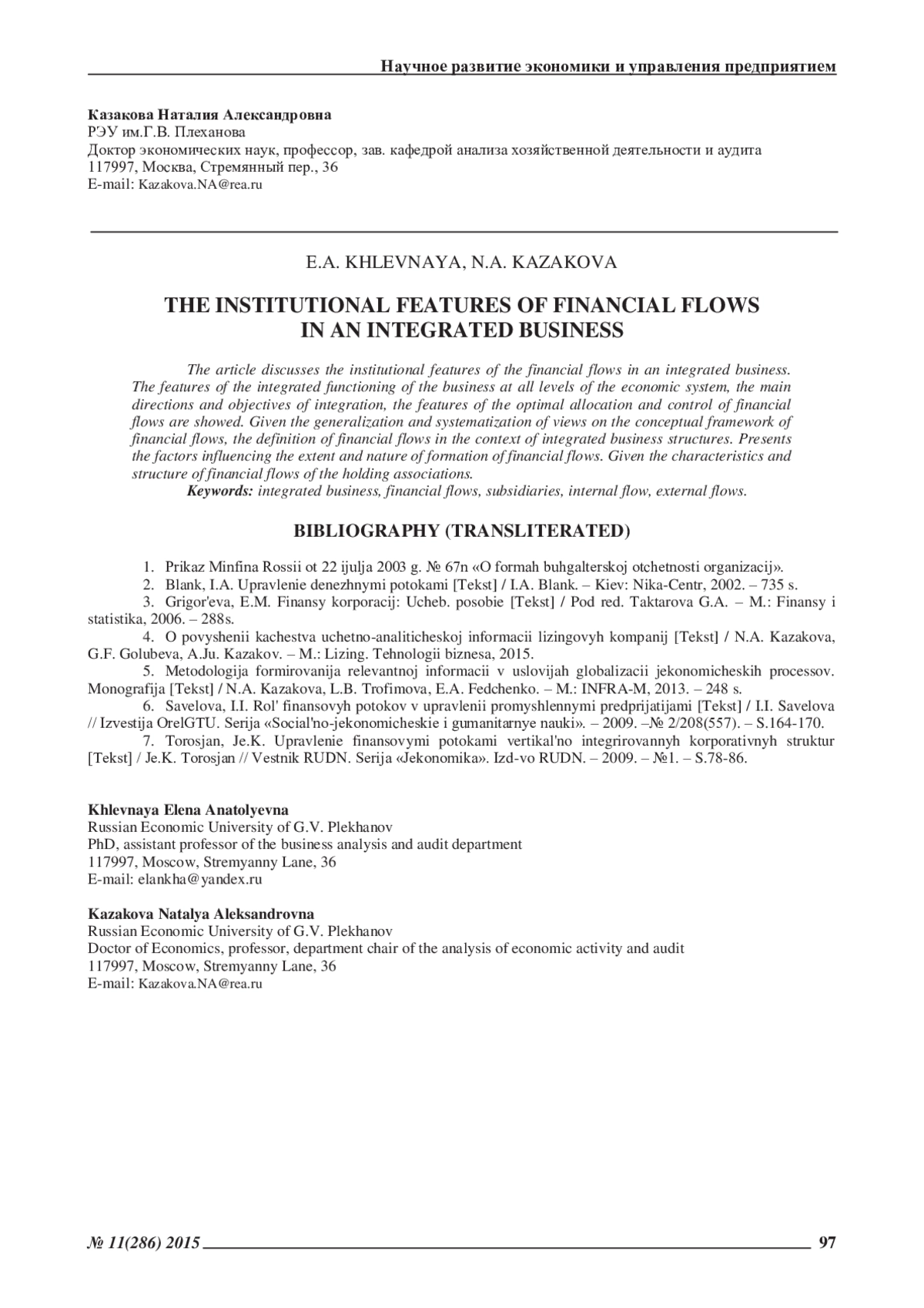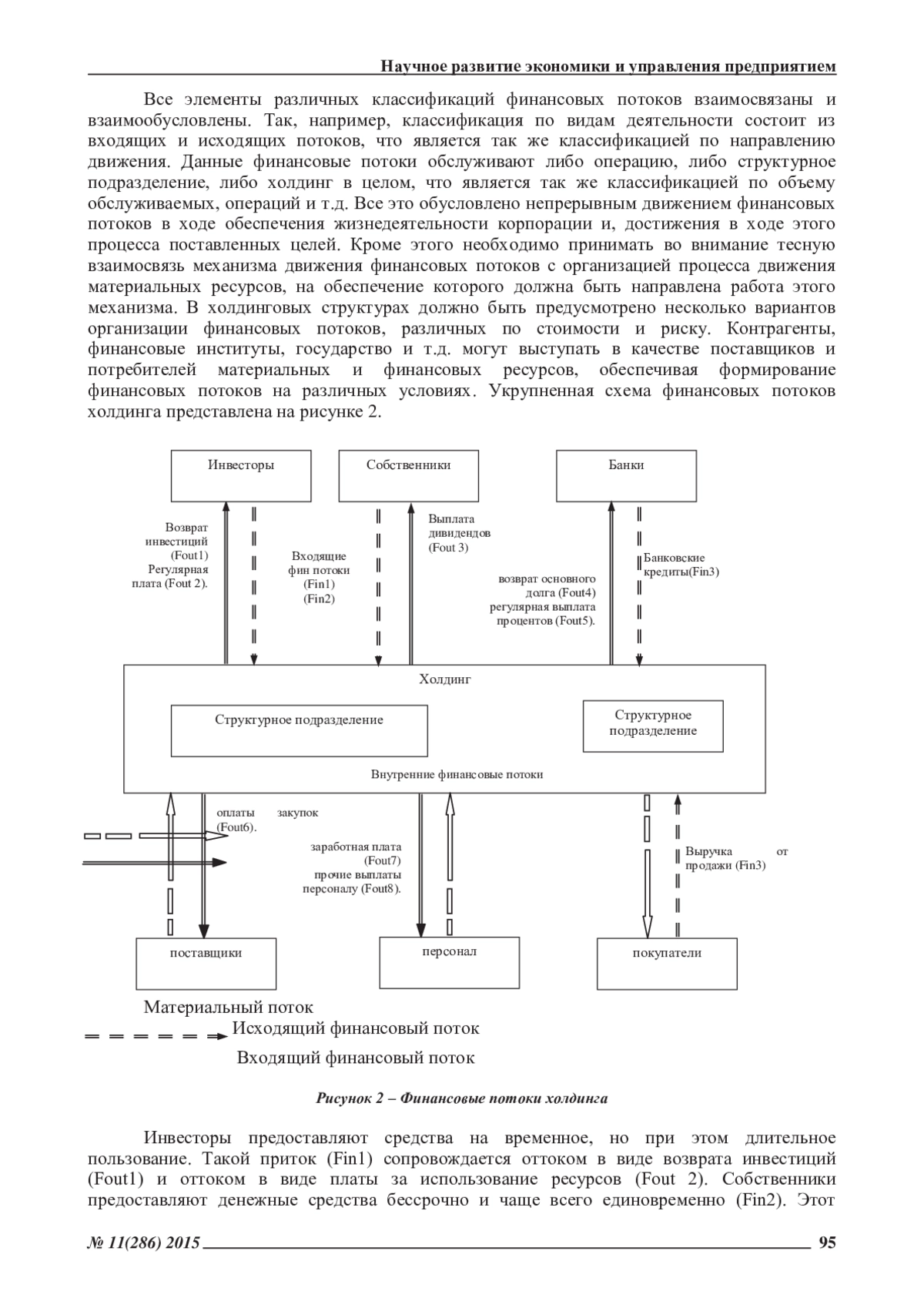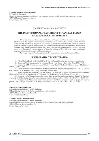 В статье рассматривается проблема институциональных особенностей финансовых потоков в интегрированном бизнесе. Представлены особенности функционирования интегрированного бизнеса на всех уровнях экономической системы, основные направления и задачи интеграции, особенности оптимального распределения и контроля финансовых потоков. Дается обобщение и систематизация взглядов на понятийный аппарат финансовых потоков, определение финансовых потоков в контексте интегрированных бизнес-структур. Представлены факторы, влияющие на объем и характер формирования финансовых потоков. Даны характеристики и структура финансовых потоков холдинговых объединений
