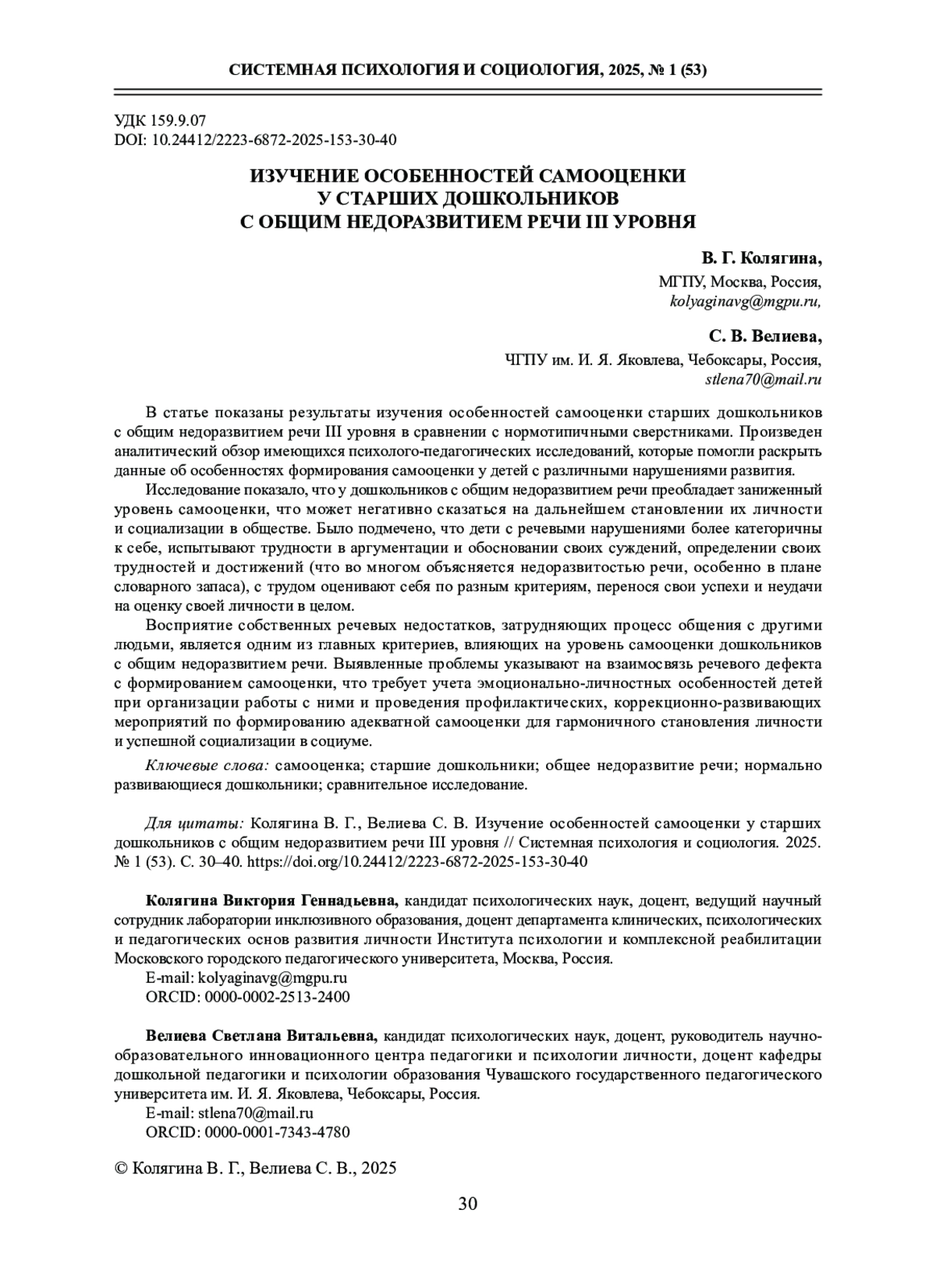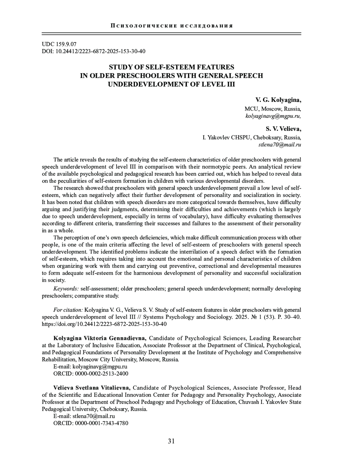 8. Римашевская Л. С., Гультяева О. А. Исследование особенностей самооценки детей старшего дошкольного возраста // Современное дошкольное образование. 2022. № 3 (111). С. 26-35. DOI: 10.24412/2782-4519-2022-3111-26-35 EDN: USARZD