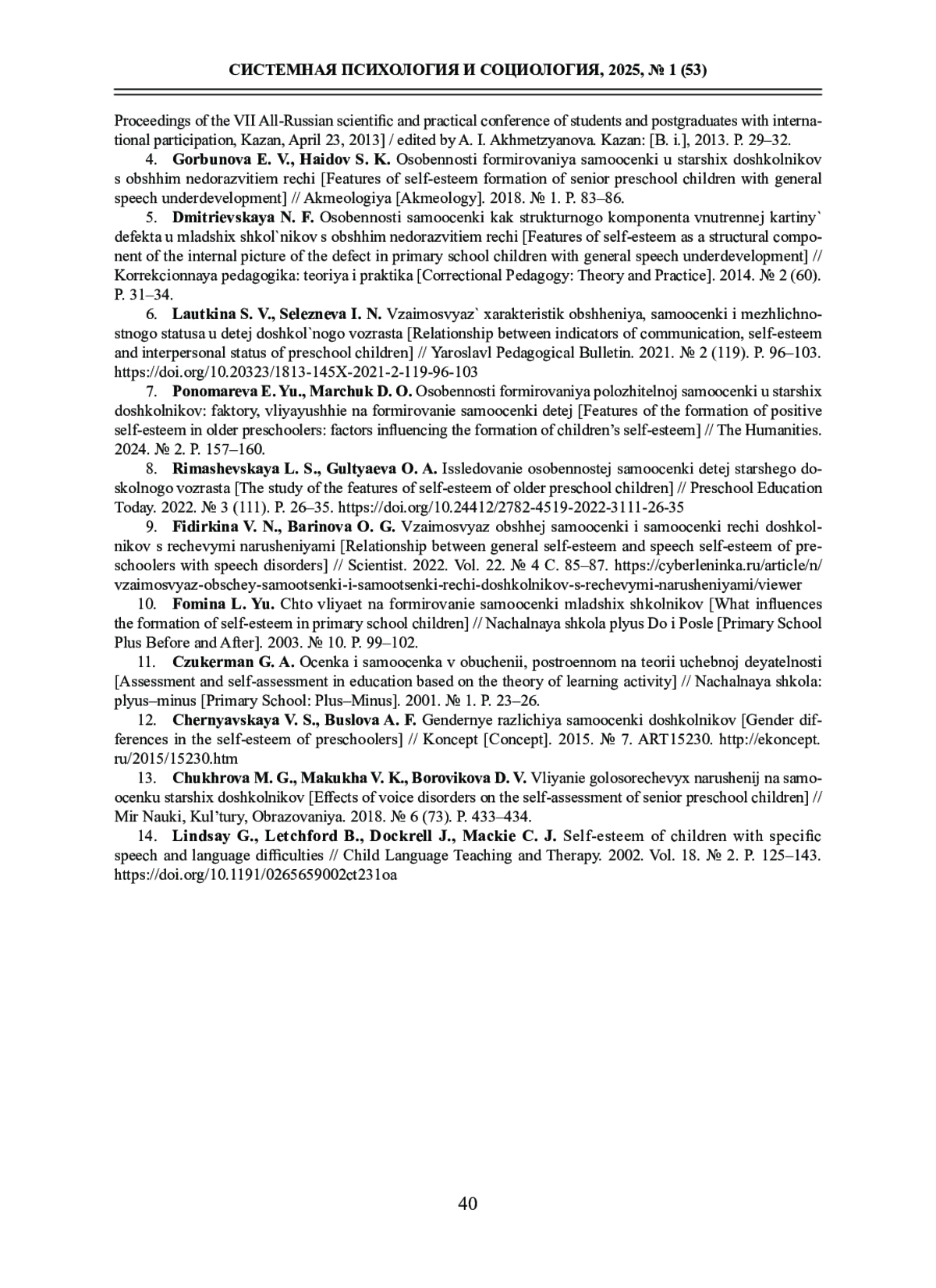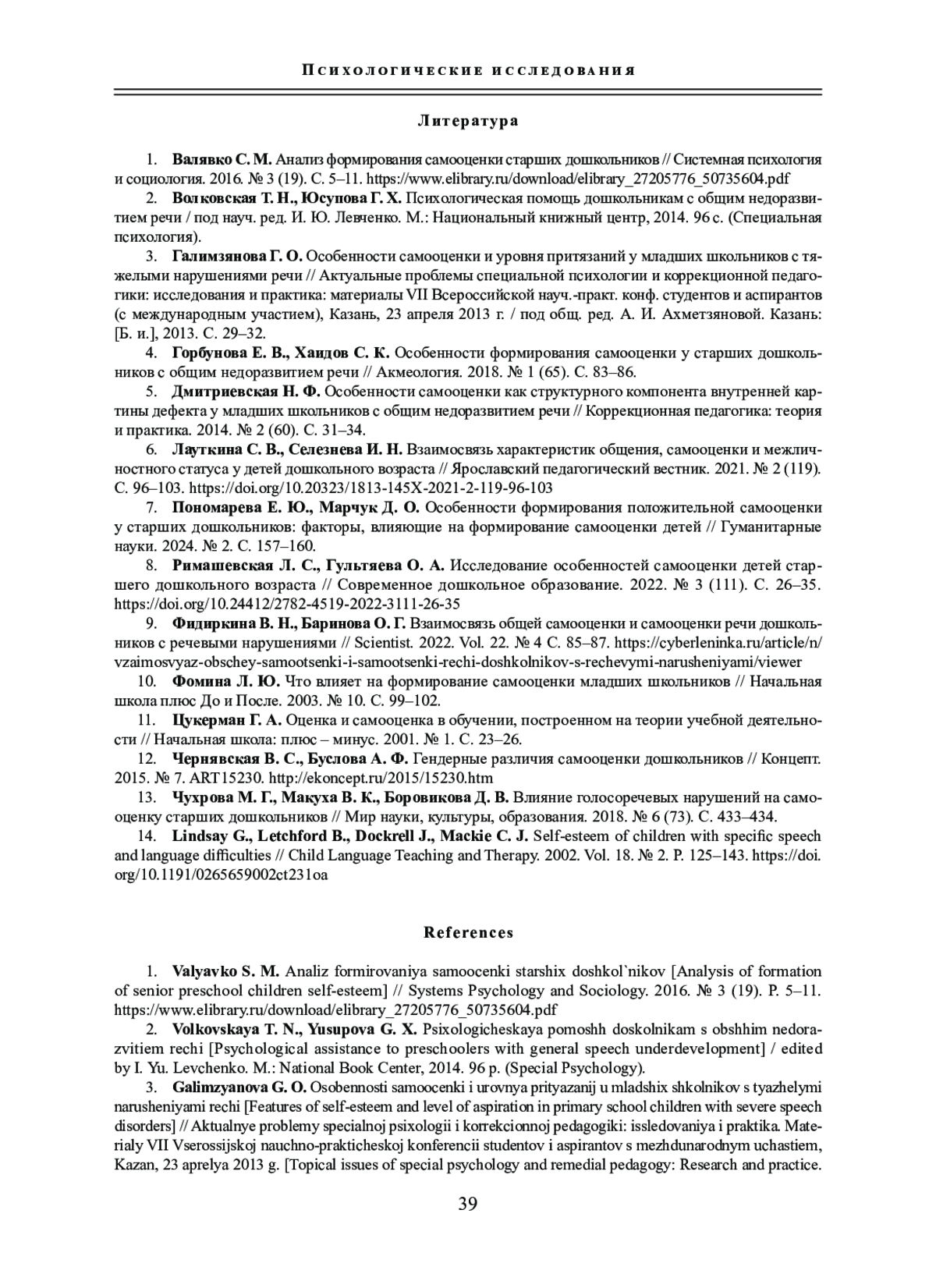 14. Lindsay G., Letchford B., Dockrell J., Mackie C. J. Self-esteem of children with specific speech and language difficulties // Child Language Teaching and Therapy. 2002. Vol. 18. № 2. P. 125-143. DOI: 10.1191/0265659002ct231oa EDN: JRAWSD