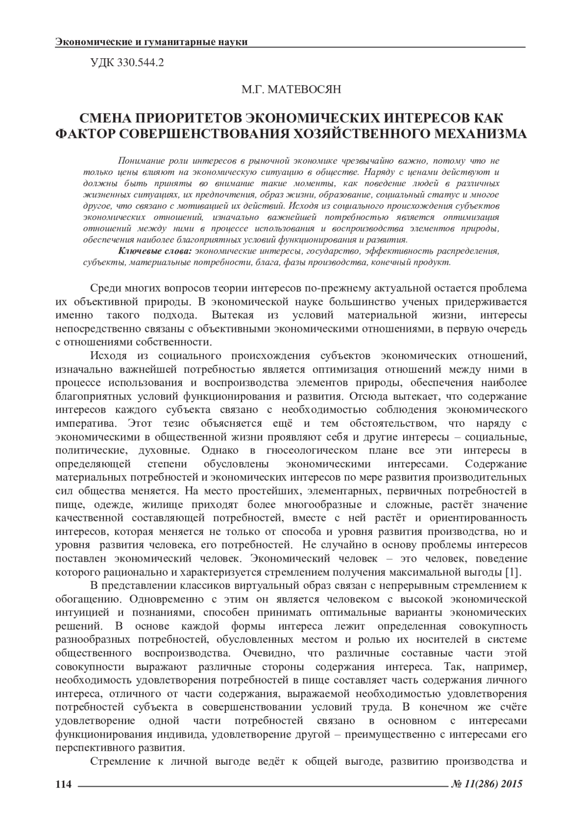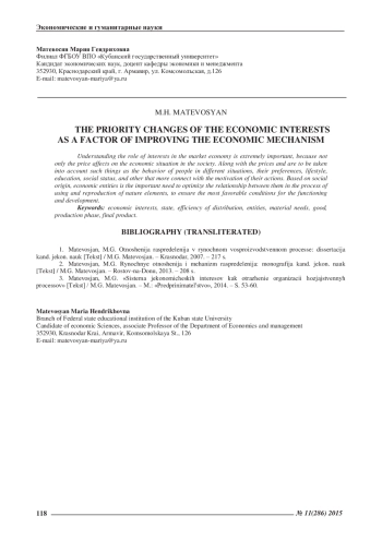 3. Матевосян, М.Г. «Система экономических интересов как отражение организации хозяйственных процессов» /М.Г. Матевосян. -М.: «Предпринимательство», 2014. -С. 53-60. EDN: TALAUJ