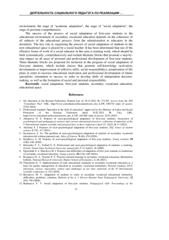 11. Бирюкова М.В. Адаптация студентов к обучению в среднем профессиональном учебном заведении: трудности, проблемы, пути решения / М. В. Бирюкова // Известия Российского государственного педагогического университета имени А. И. Герцена. № 12 (88): Психолого-педагогические науки (психология, педагогика, теория и методика обучения): Научный журнал. - 2008. - № 12 (88). - С. 158-162. EDN: JVVHSD