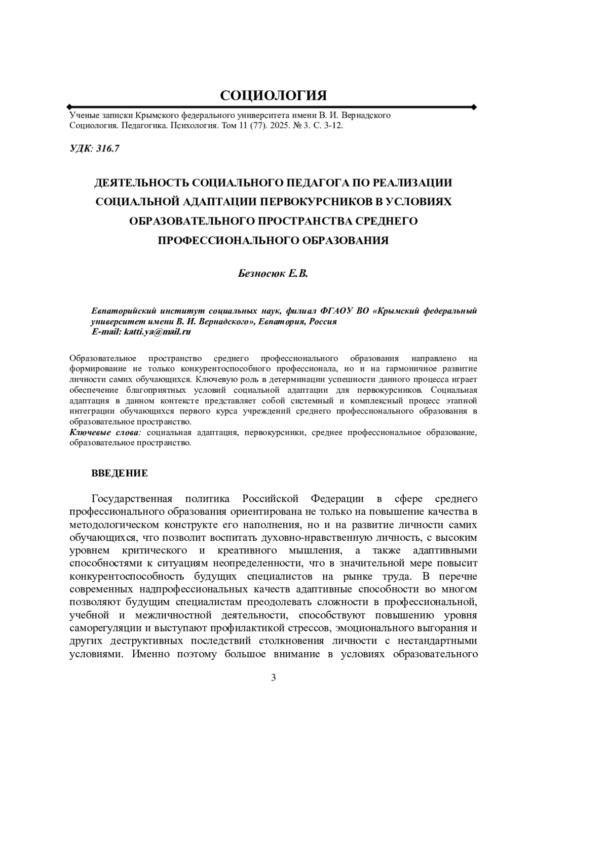 Образовательное пространство среднего профессионального образования направлено на формирование не только конкурентоспособного профессионала, но и на гармоничное развитие личности самих обучающихся. Ключевую роль в детерминации успешности данного процесса играет обеспечение благоприятных условий социальной адаптации для первокурсников. Социальная адаптация в данном контексте представляет собой системный и комплексный процесс этапной интеграции обучающихся первого курса учреждений среднего профессионального образования в образовательное пространство.
