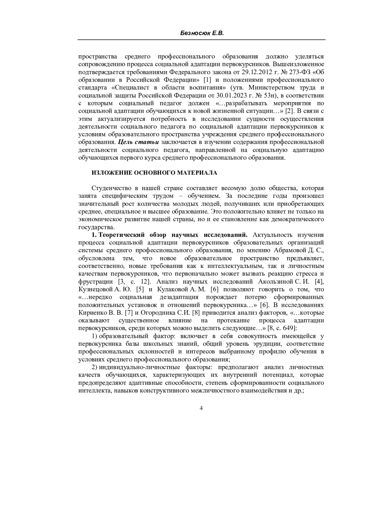 4. Акользина С. И. Особенности социально-психологической адаптации студентов-первокурсников / С. И. Акользина // Скиф. Вопросы студенческой науки. - 2023. - № 2(78). - С. 87-92. EDN: MHMCRQ