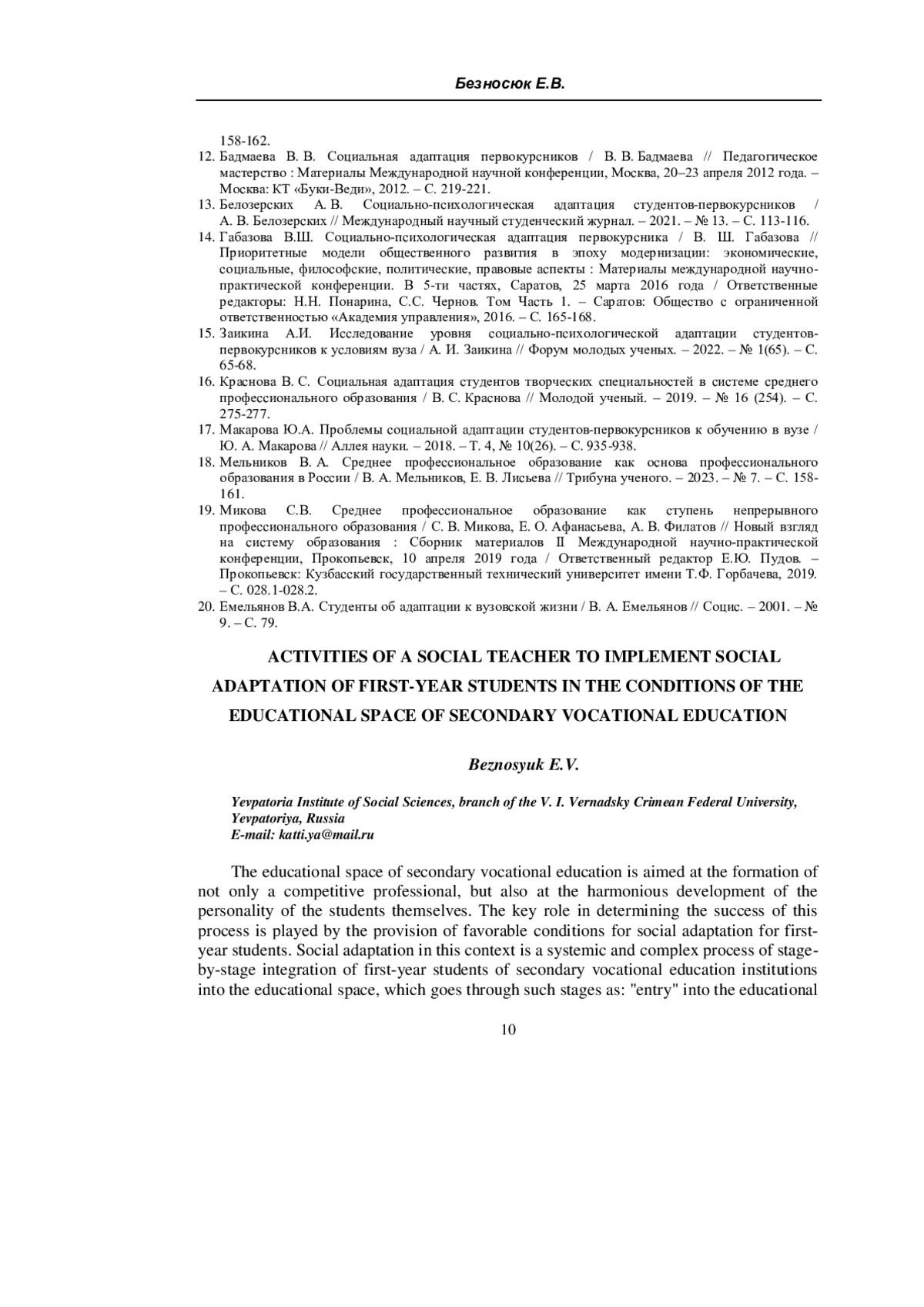 5. Кузнецова А. Ю. Проблема социально-психологической адаптации студентов среднего профессионального образования, оставшихся без попечения родителей / А. Ю. Кузнецова // Аллея науки. - 2020. - Т. 1, № 9(48). - С. 474-478. EDN: YPQEBF