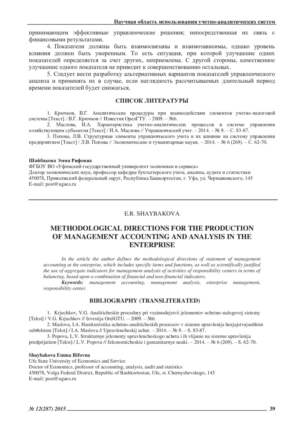 3. Попова, Л.В. Структурные элементы управленческого учета и их влияние на систему управления предприятием [Текст] / Л.В. Попова // Экономические и гуманитарные науки. - 2014. - № 6 (269). - С. 62-70. EDN: SFULOB