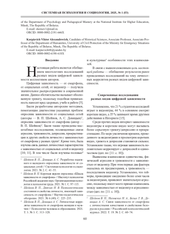 Настоящая работа является обобщением многолетних исследований разных видов цифровой зависимости коллективом авторов.