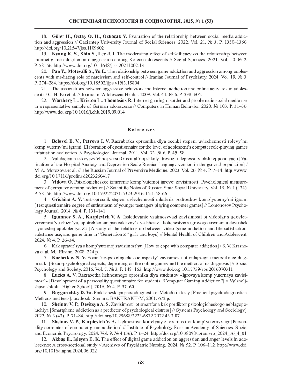 5. Игумнов С. А., Карпиевич В. А. Исследование взаимосвязи зависимости от видеоигр с удовлетворенностью жизнью, употреблением психоактивных веществ и количеством игрового времени у девушек и юношей “поколения Z” // Вопросы психического здоровья детей и подростков. 2024. № 4. С. 26-34. EDN: NUGLYM