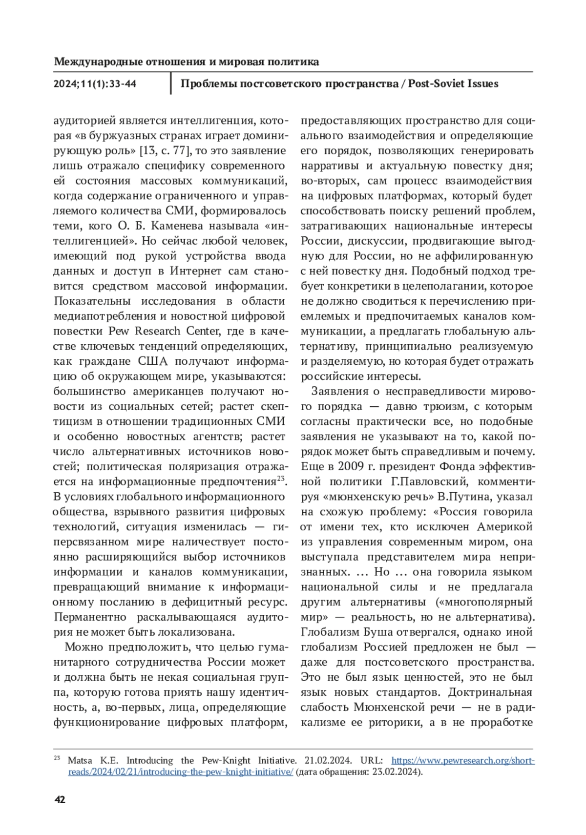 БОРИСОВ А. В. ГУМАНИТАРНАЯ ПОЛИТИКА РОССИИ: ПРОБЛЕМЫ И РЕШЕНИЯ // ПРОБЛЕМЫ ПОСТСОВЕТСКОГО ПРОСТРАНСТВА. 2025. ТОМ 11, № 1