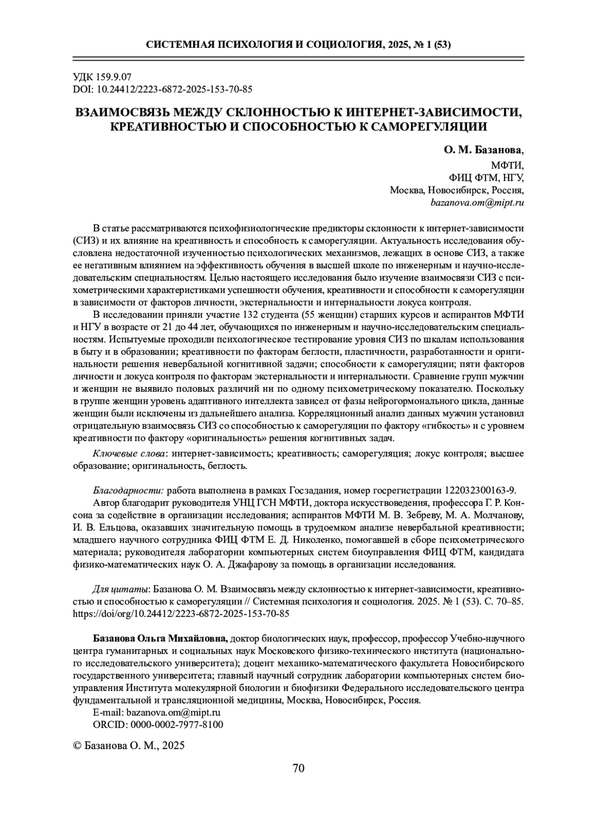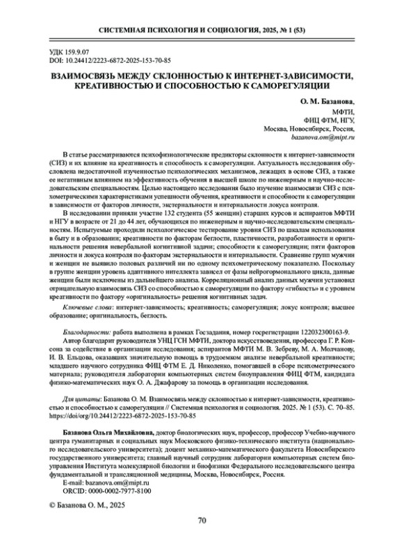 В статье рассматриваются психофизиологические предикторы склонности к интернет-зависимости (СИЗ) и их влияние на креативность и способность к саморегуляции. Актуальность исследования обусловлена недостаточной изученностью психологических механизмов, лежащих в основе СИЗ, а также ее негативным влиянием на эффективность обучения в высшей школе по инженерным и научно-исследовательским специальностям. Целью настоящего исследования было изучение взаимосвязи СИЗ с психометрическими характеристиками успешности обучения, креативности и способности к саморегуляции в зависимости от факторов личности, экстернальности и интернальности локуса контроля.