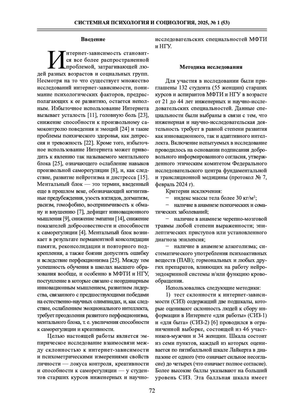 Интернет-зависимость становится все более распространенной пробле мой, затрагивающей людей разных возрастов и социальных групп. Несмотря на то что существует множество исследований интернет-зависимости, понимание психологических факторов, предрасполагающих к ее развитию, остается неполным. Избыточное использование Интернета вызывает усталость [11], головную боль [23], снижение способности к произвольному самоконтролю поведения и эмоций [24] и такие проблемы психического здоровья, как депрессия и тревожность [22].