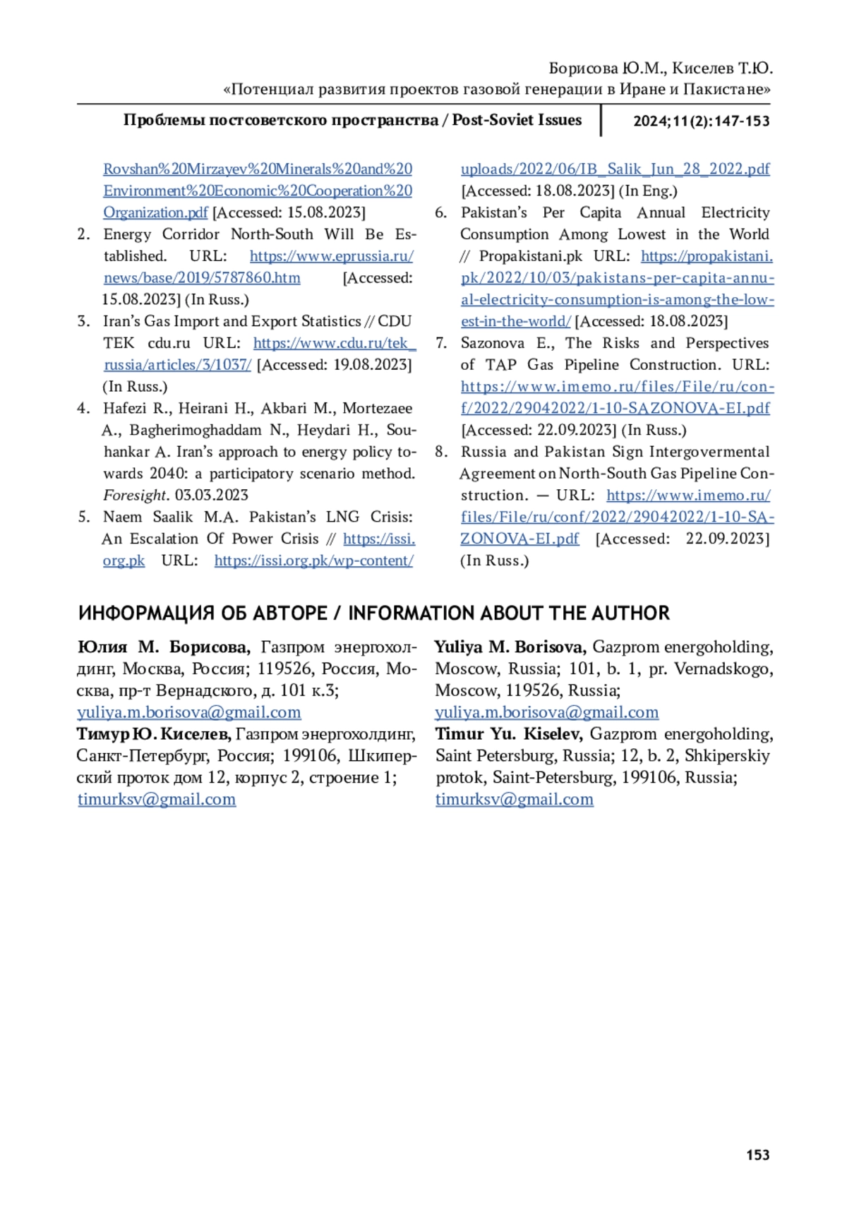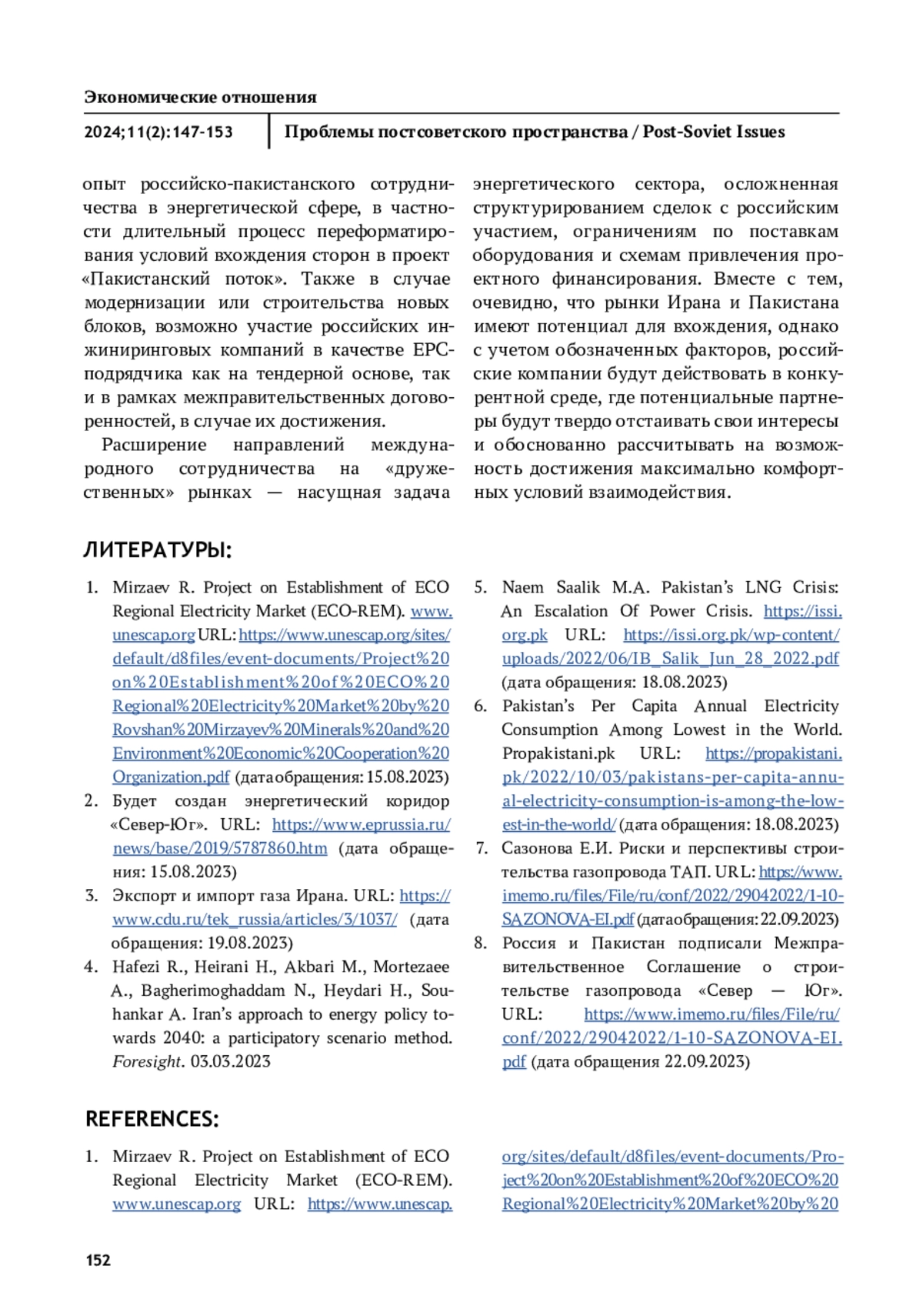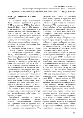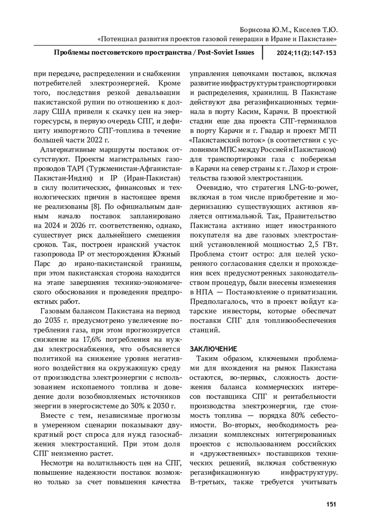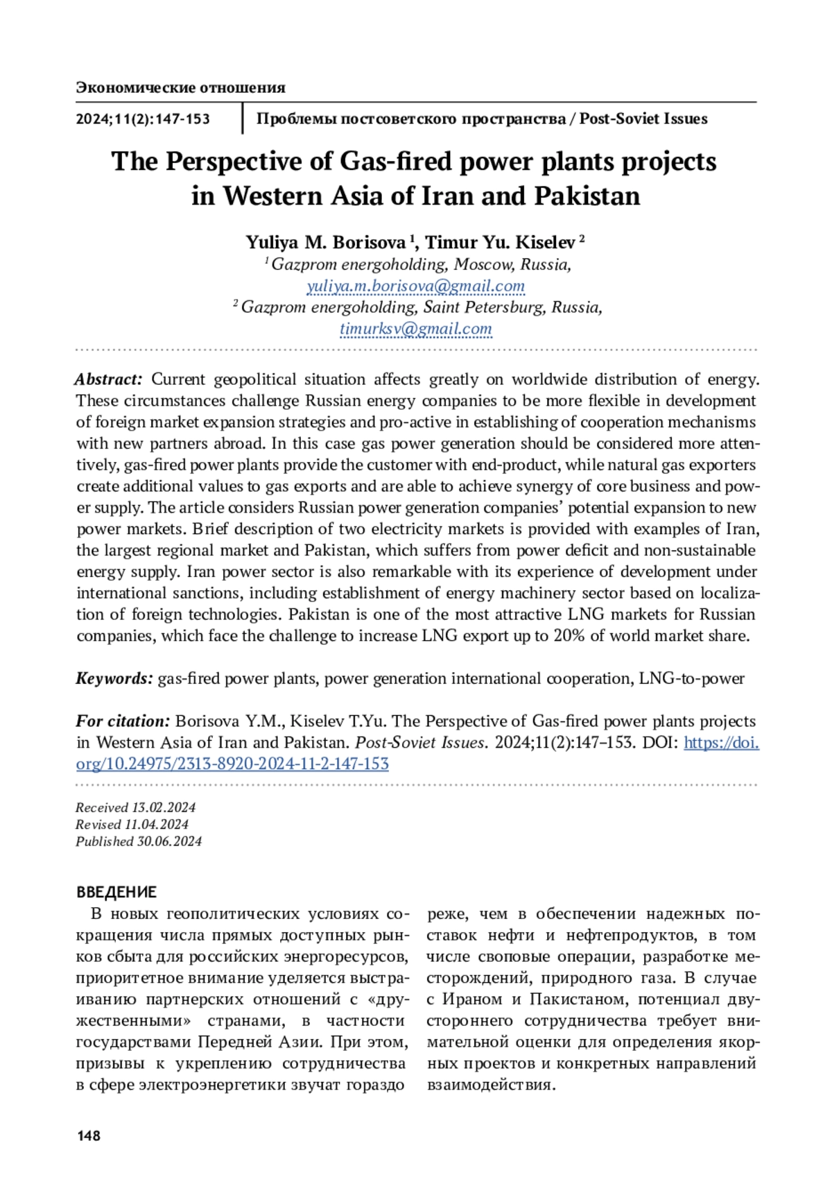 Текущие геополитические реалии оказывают значительное влияние на перераспределение энергоресурсов на мировых рынках и требуют от российских компаний гибкости при формировании стратегий международного развития и механизмов сотрудничества с новыми партнерами. При этом особое внимание следует уделить сектору газовой электрогенерации, который позволяет обеспечить иностранных потребителей конечным продуктом, а компаниям-экспортерам природного газа — создать продукт с добавленной стоимостью и обеспечить синергию от поставок природного газа и электроэнергии. В статье рассмотрены перспективы выхода российских электрогенерирующих компаний на новые рынки. Дана краткая характеристика особенностей электроэнергетических рынков двух стран — Ирана, крупнейшей региональной энергосистемы, и Пакистана — активно растущего рынка, испытывающего энергодефицит и проблемы с обеспечением надежности энергоснабжения. При этом энергетический сектор Ирана примечателен опытом развития, в том числе создания отрасли энергетического машиностроения на базе локализованных технологий, в условиях санкционного режима. Пакистан, в свою очередь — одно из самых привлекательных направлений поставок СПГ из портфеля российских компаний, перед которыми стоит задача нарастить объем поставок иностранным потребителям до 20% мирового рынка к 2030 году.