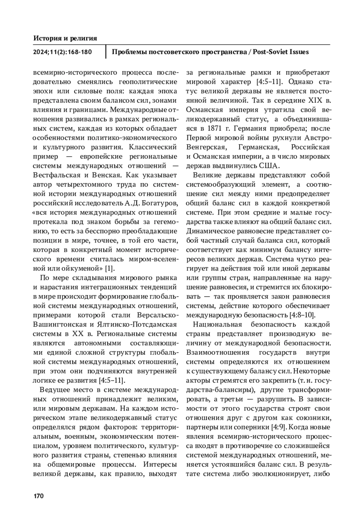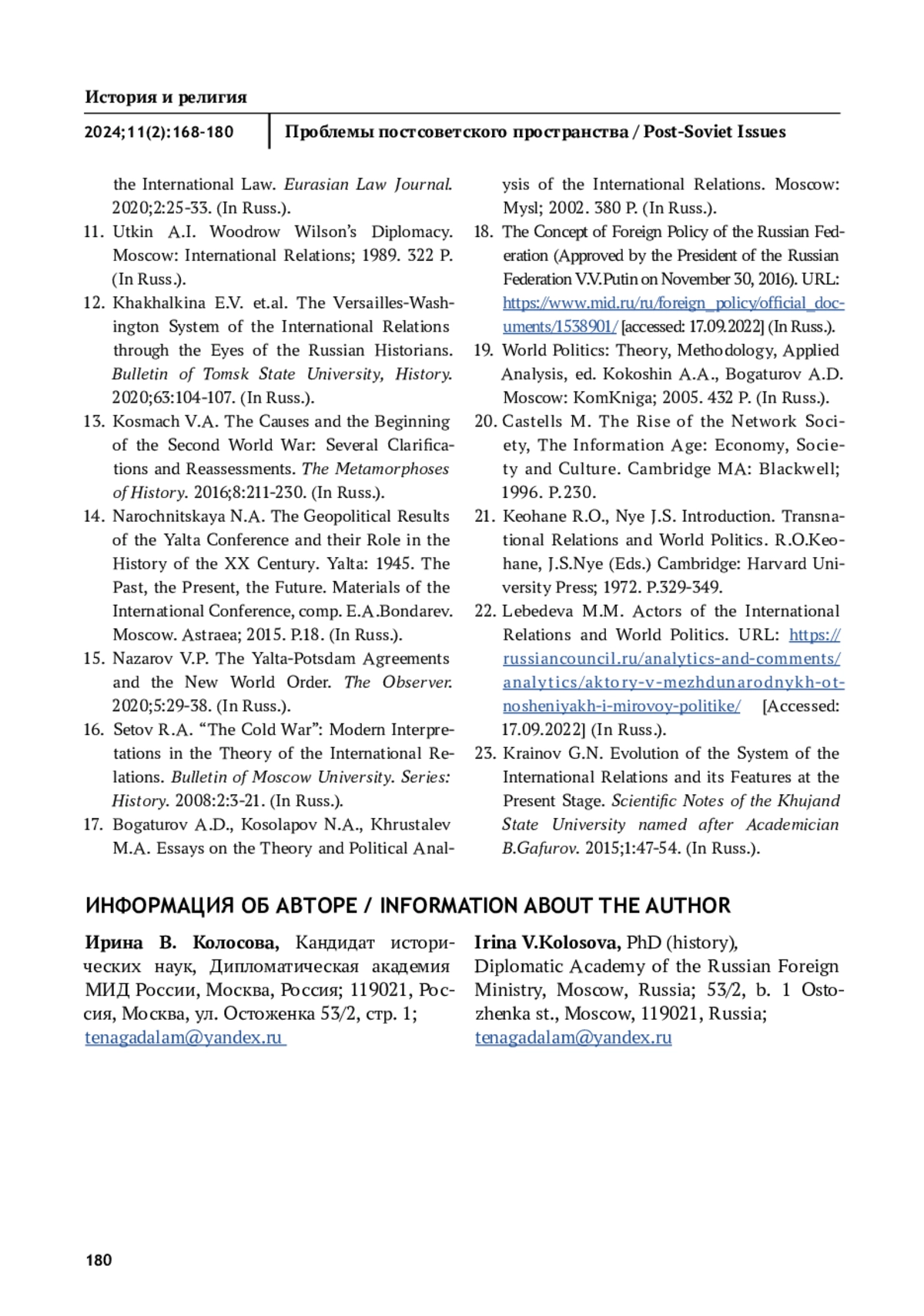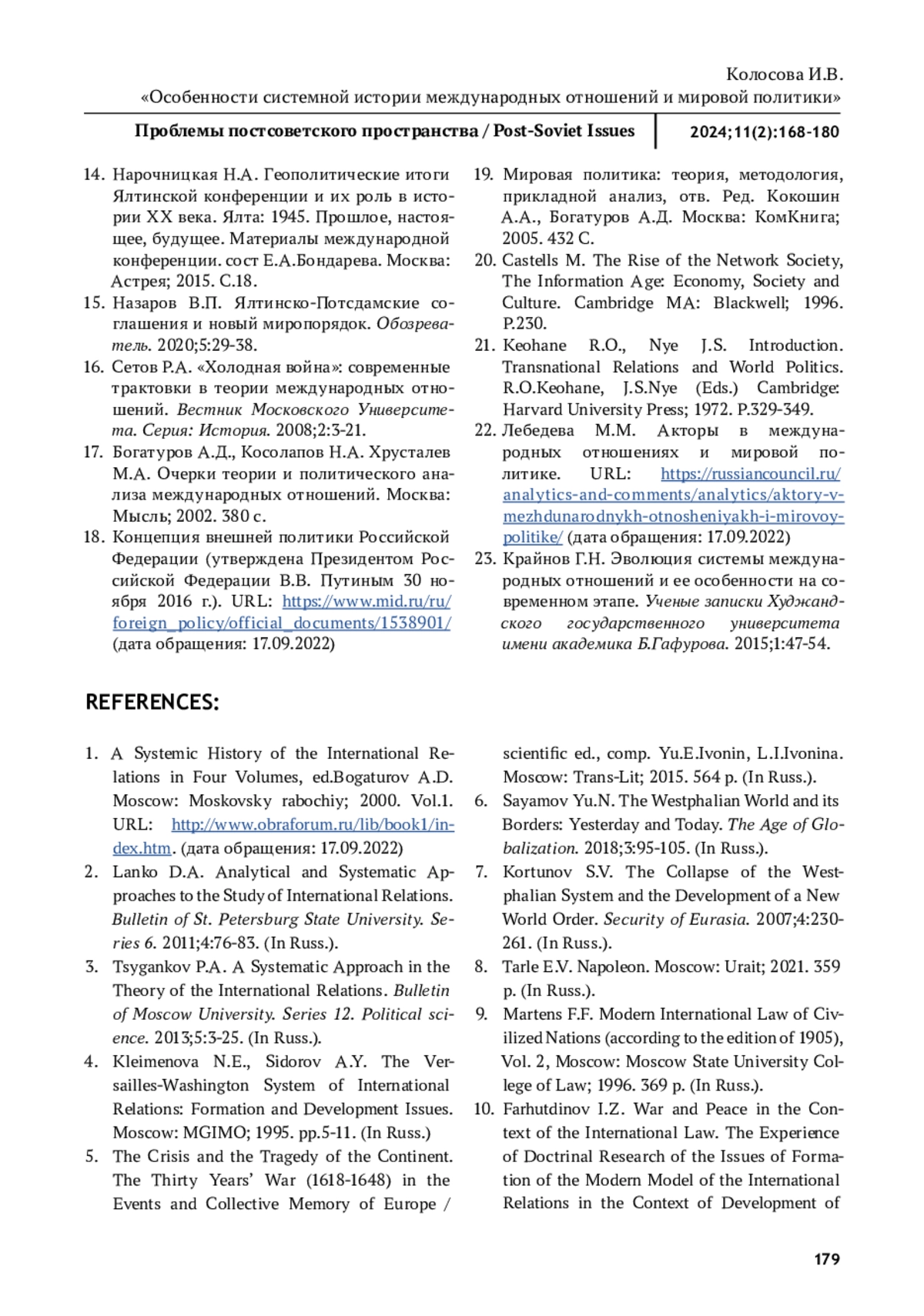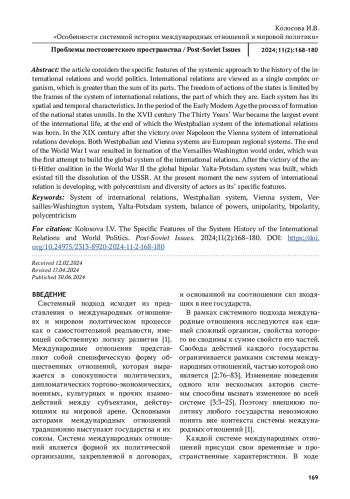 КОЛОСОВА И. В. ОСОБЕННОСТИ СИСТЕМНОЙ ИСТОРИИ МЕЖДУНАРОДНЫХ ОТНОШЕНИЙ И МИРОВОЙ ПОЛИТИКИ // ПРОБЛЕМЫ ПОСТСОВЕТСКОГО ПРОСТРАНСТВА. 2025. ТОМ 11, № 2