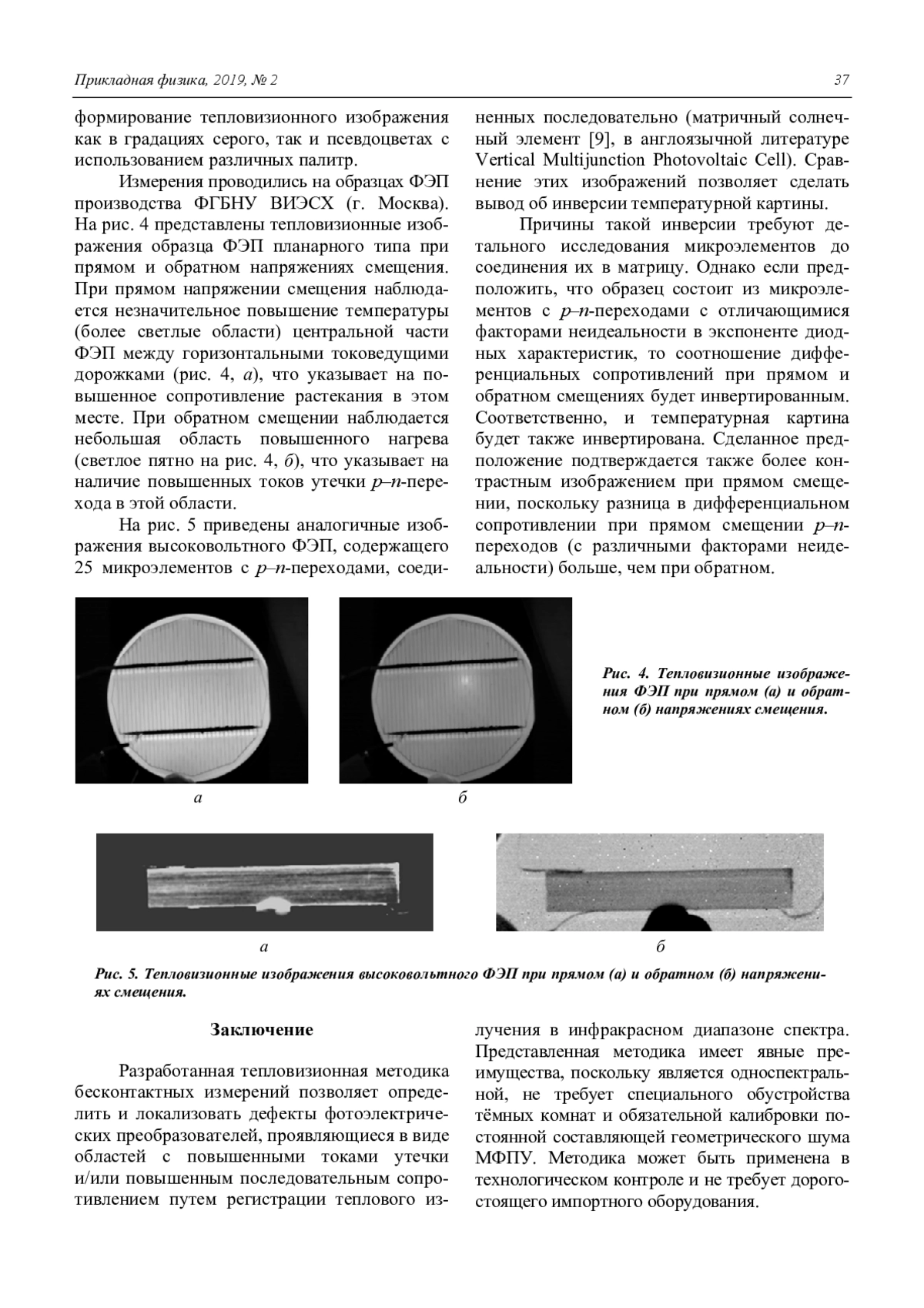 Разработанная тепловизионная методика бесконтактных измерений позволяет определить и локализовать дефекты фотоэлектрических преобразователей, проявляющиеся в виде областей с повышенными токами утечки и/или повышенным последовательным сопротивлением путем регистрации теплового излучения в инфракрасном диапазоне спектра. Представленная методика имеет явные преимущества, поскольку является односпектральной, не требует специального обустройства тёмных комнат и обязательной калибровки постоянной составляющей геометрического шума МФПУ. Методика может быть применена в технологическом контроле и не требует дорогостоящего импортного оборудования.