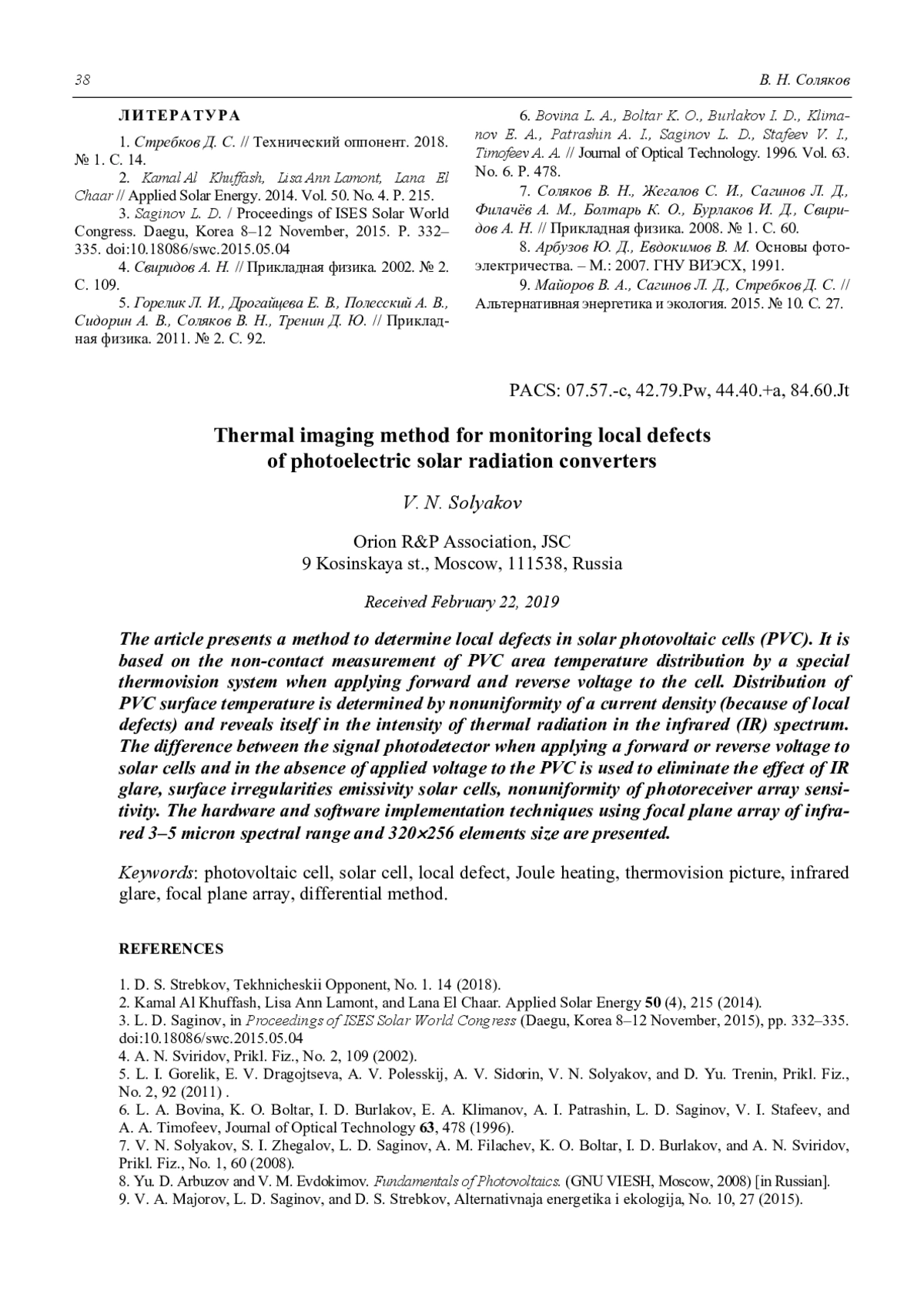 V. N. Solyakov Thermal imaging method for monitoring local defects of photoelectric solar radiation converters 33