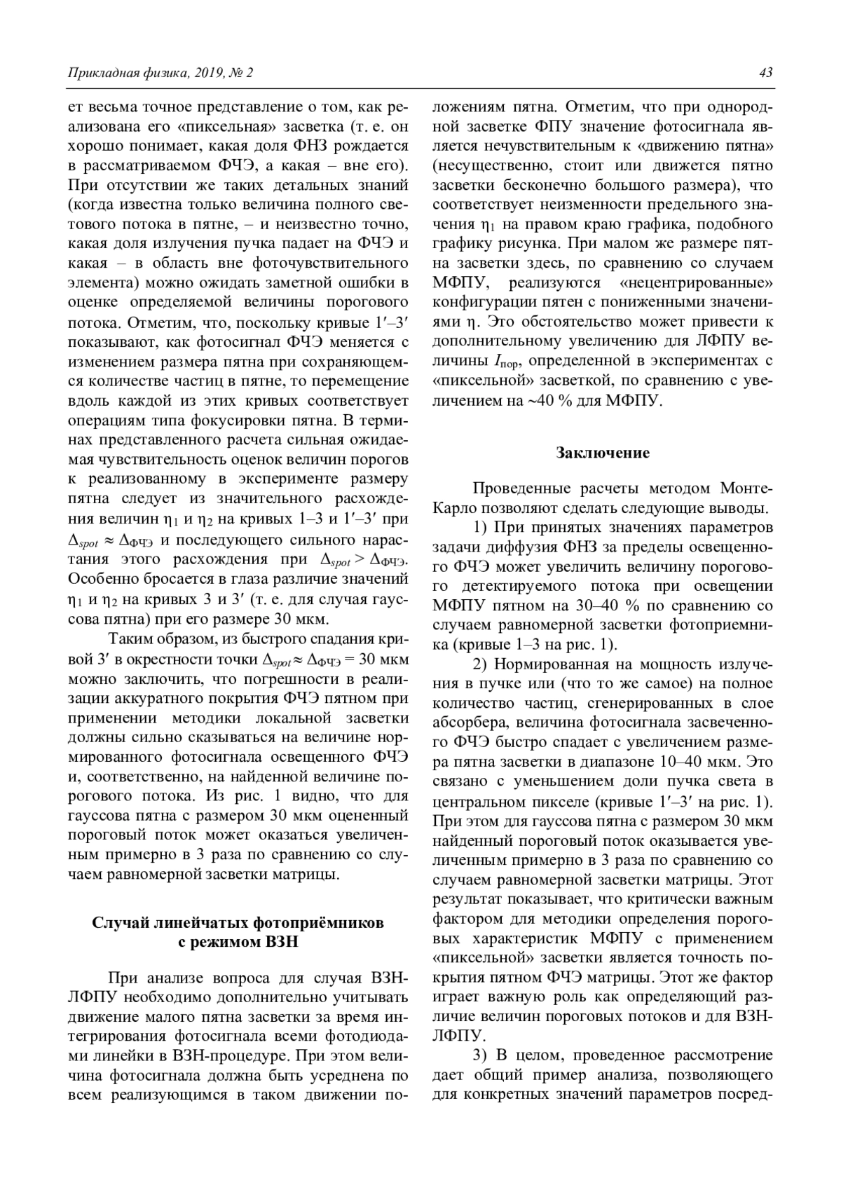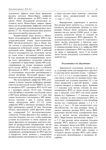 Проведенные расчеты методом МонтеКарло позволяют сделать следующие выводы. 1) При принятых значениях параметров задачи диффузия ФНЗ за пределы освещенного ФЧЭ может увеличить величину порогового детектируемого потока при освещении МФПУ пятном на 30–40 % по сравнению со случаем равномерной засветки фотоприемника (кривые 1–3 на рис. 1). 2) Нормированная на мощность излучения в пучке или (что то же самое) на полное количество частиц, сгенерированных в слое абсорбера, величина фотосигнала засвеченного ФЧЭ быстро спадает с увеличением размера пятна засветки в диапазоне 10–40 мкм. Это связано с уменьшением доли пучка света в центральном пикселе (кривые 1–3 на рис. 1). При этом для гауссова пятна с размером 30 мкм найденный пороговый поток оказывается увеличенным примерно в 3 раза по сравнению со случаем равномерной засветки матрицы. Этот результат показывает, что критически важным фактором для методики определения пороговых характеристик МФПУ с применением «пиксельной» засветки является точность покрытия пятном ФЧЭ матрицы. Этот же фактор играет важную роль как определяющий различие величин пороговых потоков и для ВЗНЛФПУ. 3) В целом, проведенное рассмотрение дает общий пример анализа, позволяющего для конкретных значений параметров посредством моделирования методом Монте-Карло предсказать величины пороговых характеристик многоэлементных ФПУ, определенных с использованием локальной («пиксельной») засветки фотоприёмника и его однородной засветки.