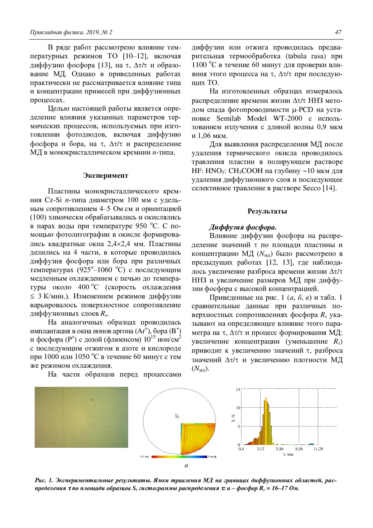Показано, что на величину времени жиз-ни неосновных носителей заряда (ННЗ), неравномерности /, концентрации и типа МД при диффузионных процессах влияют не только температура, но и вид примеси и ее концентрация. Приведенные результаты показывают сильное влияние концентрации фос-фора при значениях больше (2–4)×1019 см-3 (соответственно Rs < 10 Ом/□) на концентрацию и размеры КП и более слабое влияние в случае диффузии бора. Существует пороговая величина дозы фосфора (Rs 10 Ом/□), соответствующая поверхностной концентрации (2–4)1019 см-3, при которой наблюдается резкое увеличение значений , / и концентрации ДУ. Полученные результаты можно объяснить одновременным влиянием увеличения концентрации вакансий на размеры и плотность кислородных преципитатов и геттерирования металлических примесей диффузионными областями с высокой концентрацией фосфора (Rs < 10 Ом/□), что согласуется с результатами работ по выращиванию слитков с высоким уровнем легирования бором, фосфором и мышьяком. Предварительный отжиг при 1100 оС значительно снижает неравномерность в распределении времени жизни / ННЗ при последующих диффузионных процессах при со-хранении достаточно высоких значений .