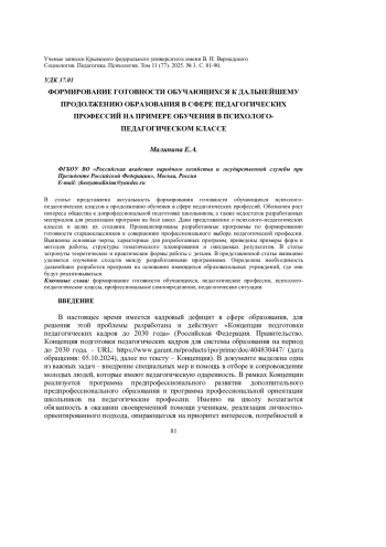 В статье представлена актуальность формирования готовности обучающихся психолого-педагогических классов к продолжению обучения в сфере педагогических профессий. Обозначен рост интереса общества к допрофессиональной подготовке школьников, а также недостаток разработанных материалов для реализации программ на базе школ. Дано представление о психолого-педагогических классах и целях их создания. Проанализированы разработанные программы по формированию готовности старшеклассников к совершению профессионального выбора педагогической профессии. Выявлены основные черты, характерные для разработанных программ, приведены примеры форм и методов работы, структуры тематического планирования и ожидаемых результатов. В статье затронуты теоретические и практические формы работы с детьми. В представленной статье внимание уделяется изучению сходств между разработанными программами. Определена необходимость дальнейших разработок программ на основании имеющихся образовательных учреждений, где они будут реализовываться.