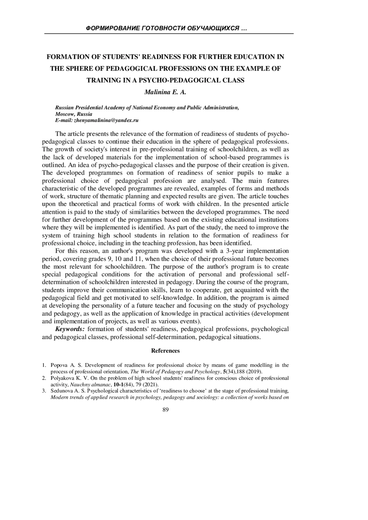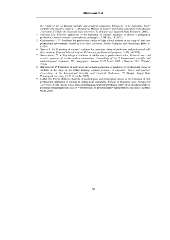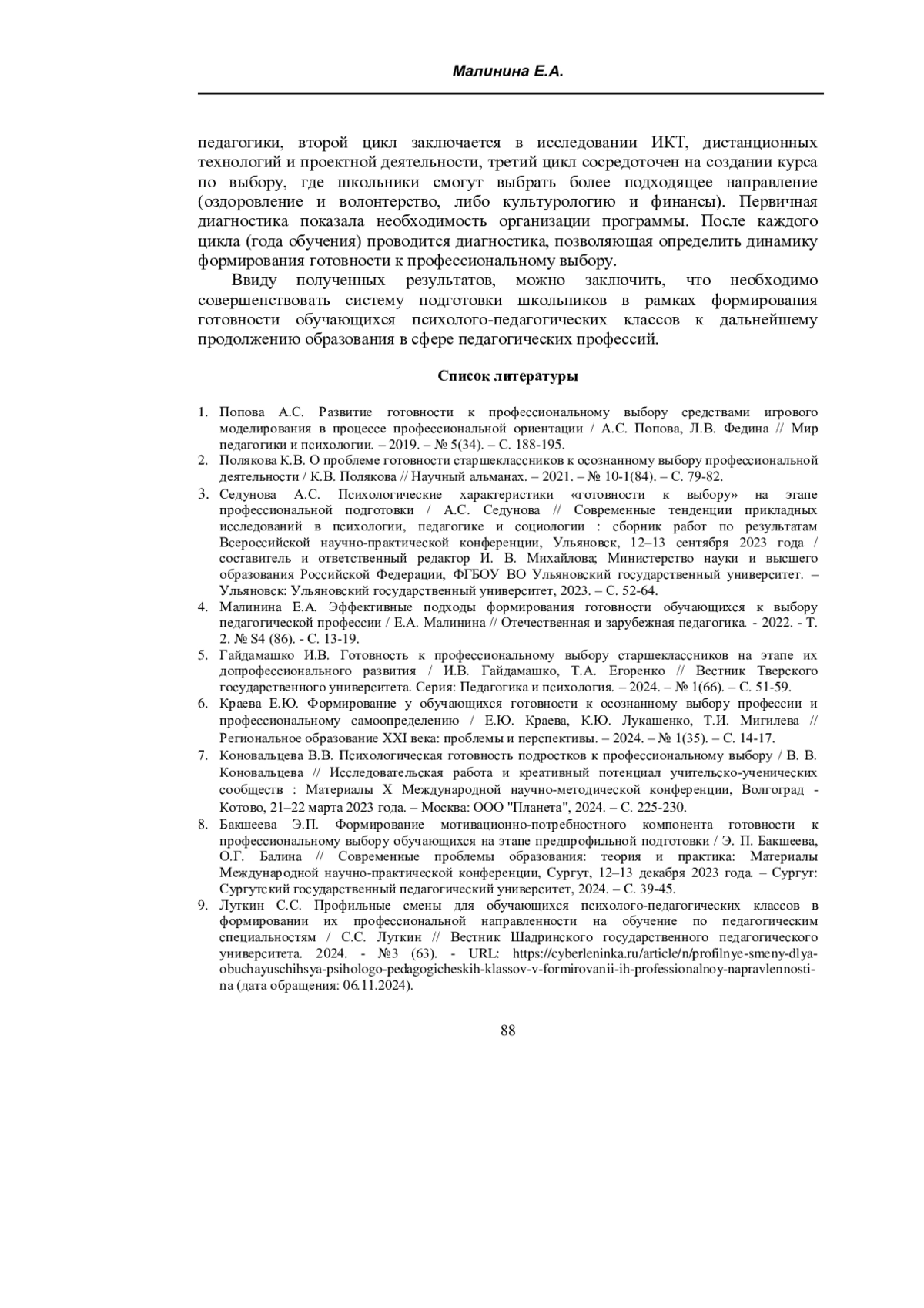4. Малинина Е.А. Эффективные подходы формирования готовности обучающихся к выбору педагогической профессии / Е.А. Малинина // Отечественная и зарубежная педагогика. - 2022. - Т. 2. № S4 (86). - С. 13-19. EDN: WJQRYS