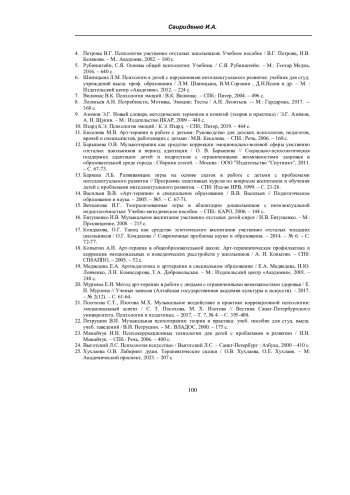 14. Васильев В.В. “Арт-терапия” в специальном образовании / В.В. Васильев // Педагогическое образование и наука. - 2005. - №5. - С. 67-71. 15. Вечканова И.Г. Театрализованные игры в абилитации дошкольников с интелектуальной недостаточностью: Учебно-методическое пособие. - СПб.: КАРО, 2006. - 144 с. EDN: TRBGBP