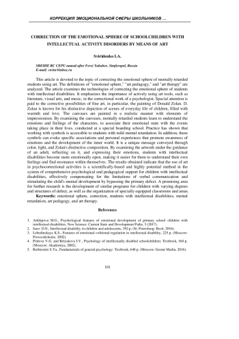 Настоящая статья посвящена теме коррекции эмоциональной сферы умственно отсталых школьников средствами искусства. Анализируются дефиниции «эмоциональная сфера», «арт-педагогика», «арт-терапия». Рассматриваются технологии коррекционного воздействия на эмоциональную сферу учащихся с нарушением интеллектуальной деятельности. Подчеркивается необходимость активного использования средств искусства: литературы, изобразительного искусства, музыки, - в коррекционной работе педагога-психолога. Особое внимание уделяется коррекционным возможностям изобразительного искусства, в частности, живописи Дональда Золана.