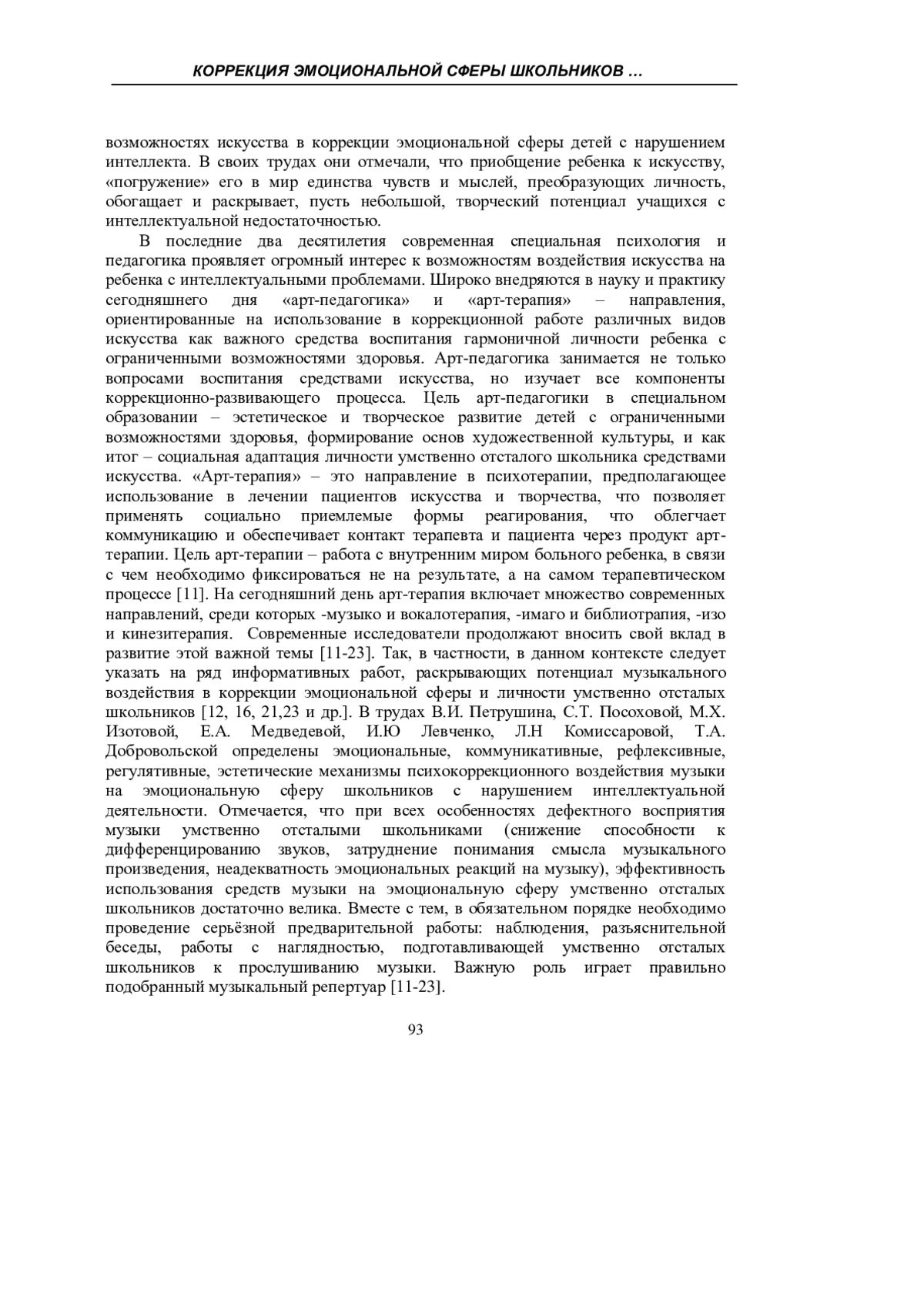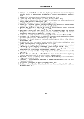 12. Барышева О.В. Музыкотерапия как средство коррекции эмоционально-волевой сферы умственно отсталых школьников в период адаптации / О. В. Барышева // Социально-психологическая поддержка адаптации детей и подростков с ограниченными возможностями здоровья в образовательной среде города: Сборник статей. - Москва: ООО “Издательство “Спутник+”, 2011. - С. 67-73. EDN: VJRSCR