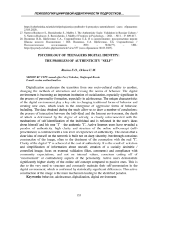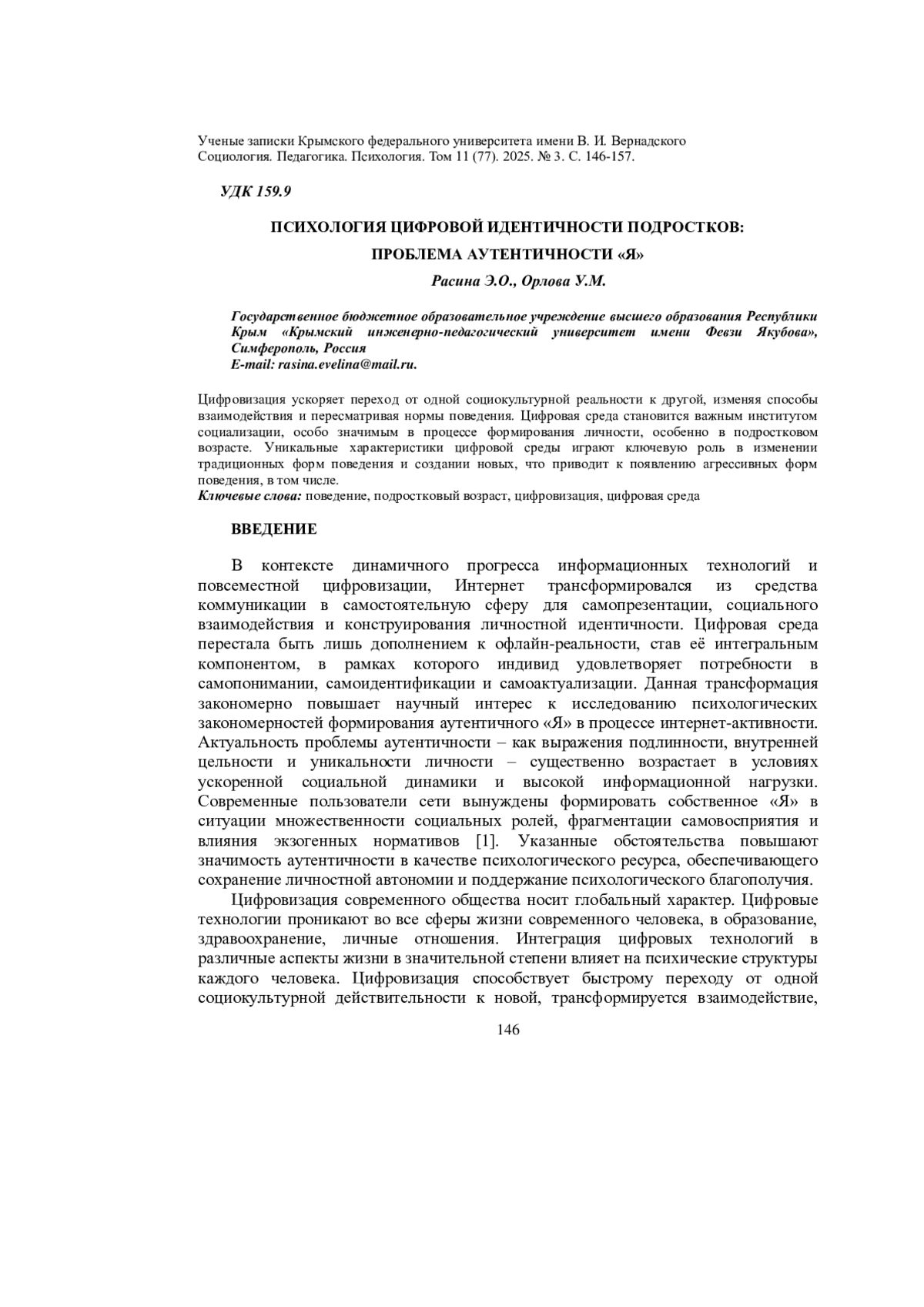7. Лучинкина И.С., А.С. Андреев, Л.В. Жихарева, Э. О. Расина Психологические особенности поведения подростков в цифровой среде / И. С. Лучинкина, А. С. Андреев, Л. В. Жихарева, Э. О. Расина // Ученые записки Крымского федерального университета имени В.И. Вернадского. Социология. Педагогика. Психология. - 2024. - Т. 10 (76), № 4. - С. 164-171. EDN: LWFADS