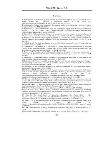 1. Бардадымов В.А. Аутентичность личности подростков на разных стадиях аддиктивного поведения: автореф. дис. … канд. психол. наук. / В.А. Бардадымов- М., 2012. - 27 с. - URL: https://dlib.rsl.ru/viewer/01005019583#?page=1 (дата обращения: 25.05.2025). EDN: QICFWB