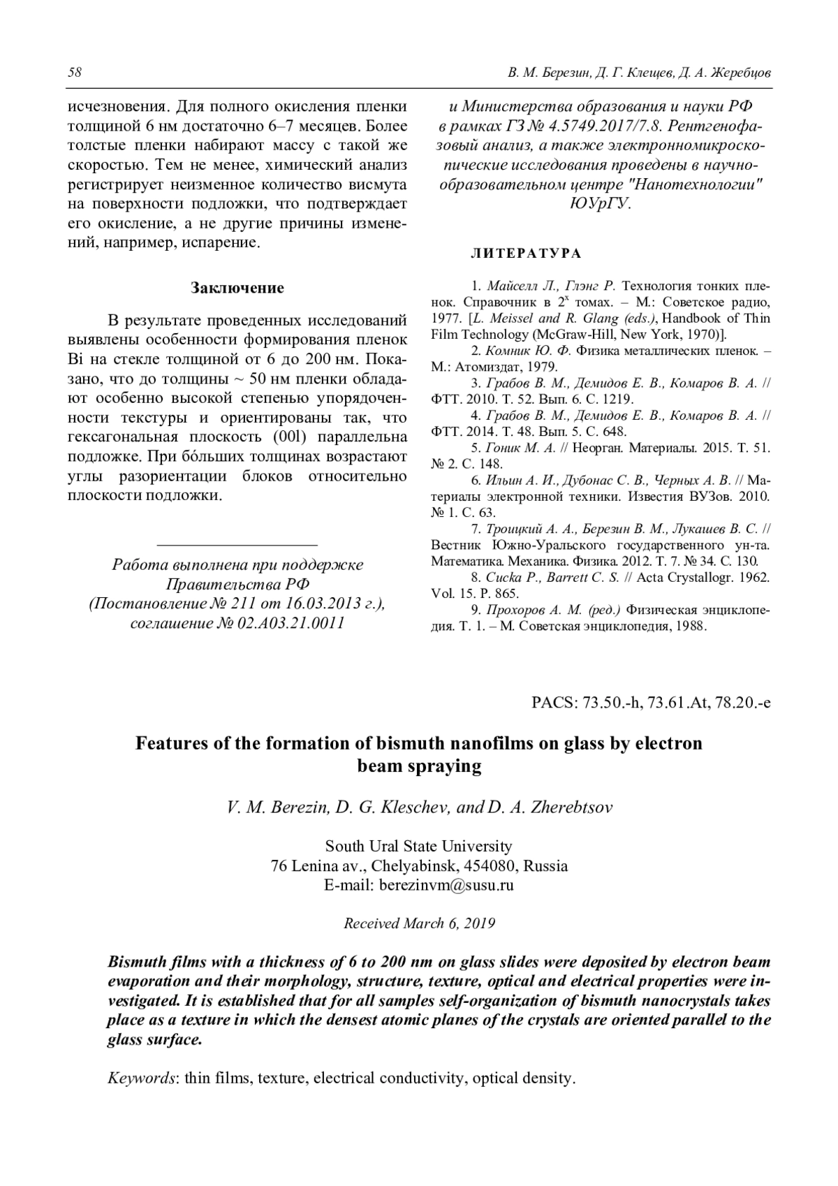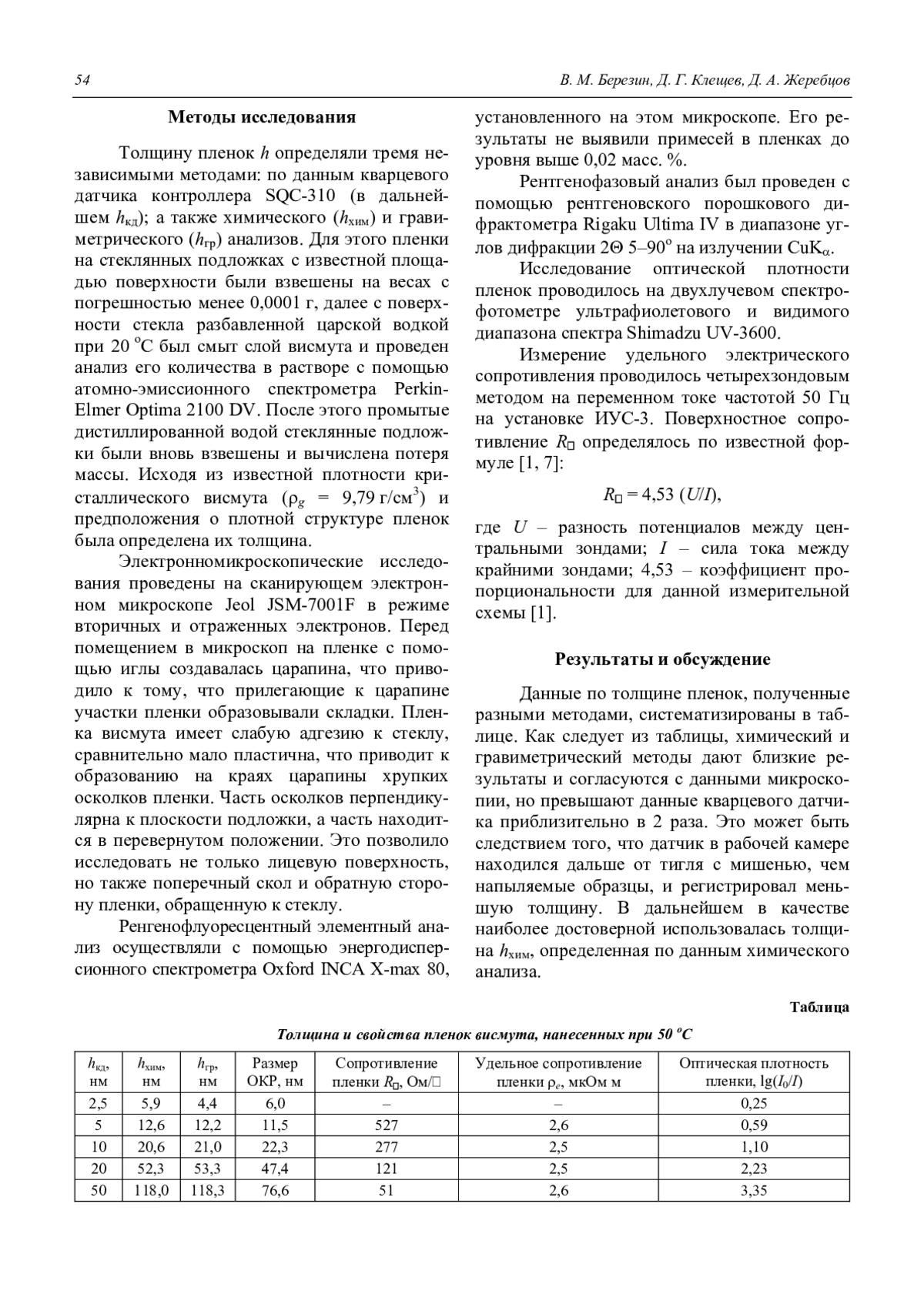 Березин В. М., Клещев Д. Г., Жеребцов Д. А. Особенности формирования нанопленок висмута на стекле электронно-лучевым распы-лением 53