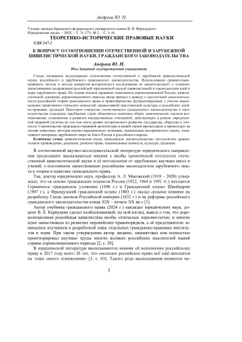 В отечественной научно-исследовательской литературе юридического направления продолжают высказываться мнения о якобы хронической отсталости отечественной цивилистической науки и еѐ методологии от зарубежных научных школ и учений, о постоянном заимствовании российским законодателем зарубежного опыта в теории и практике гражданского права.