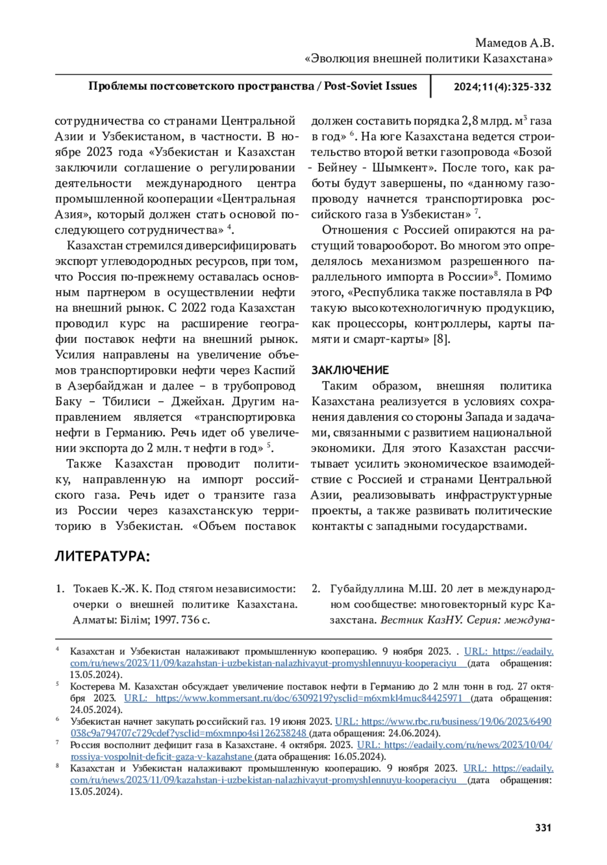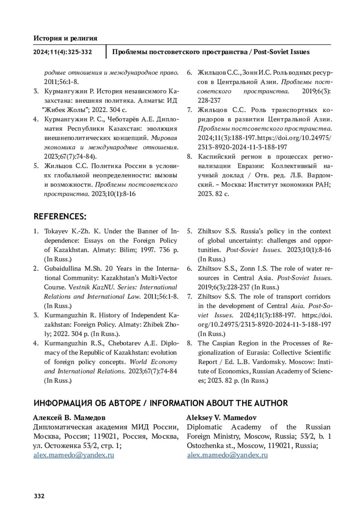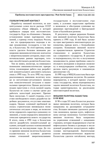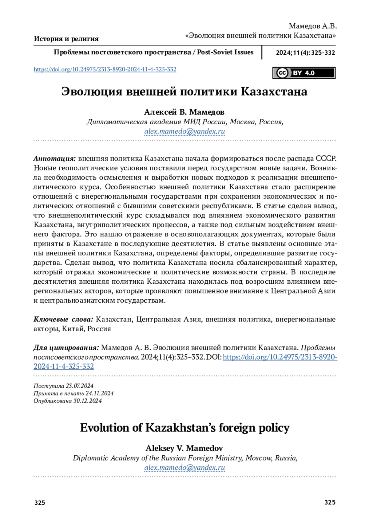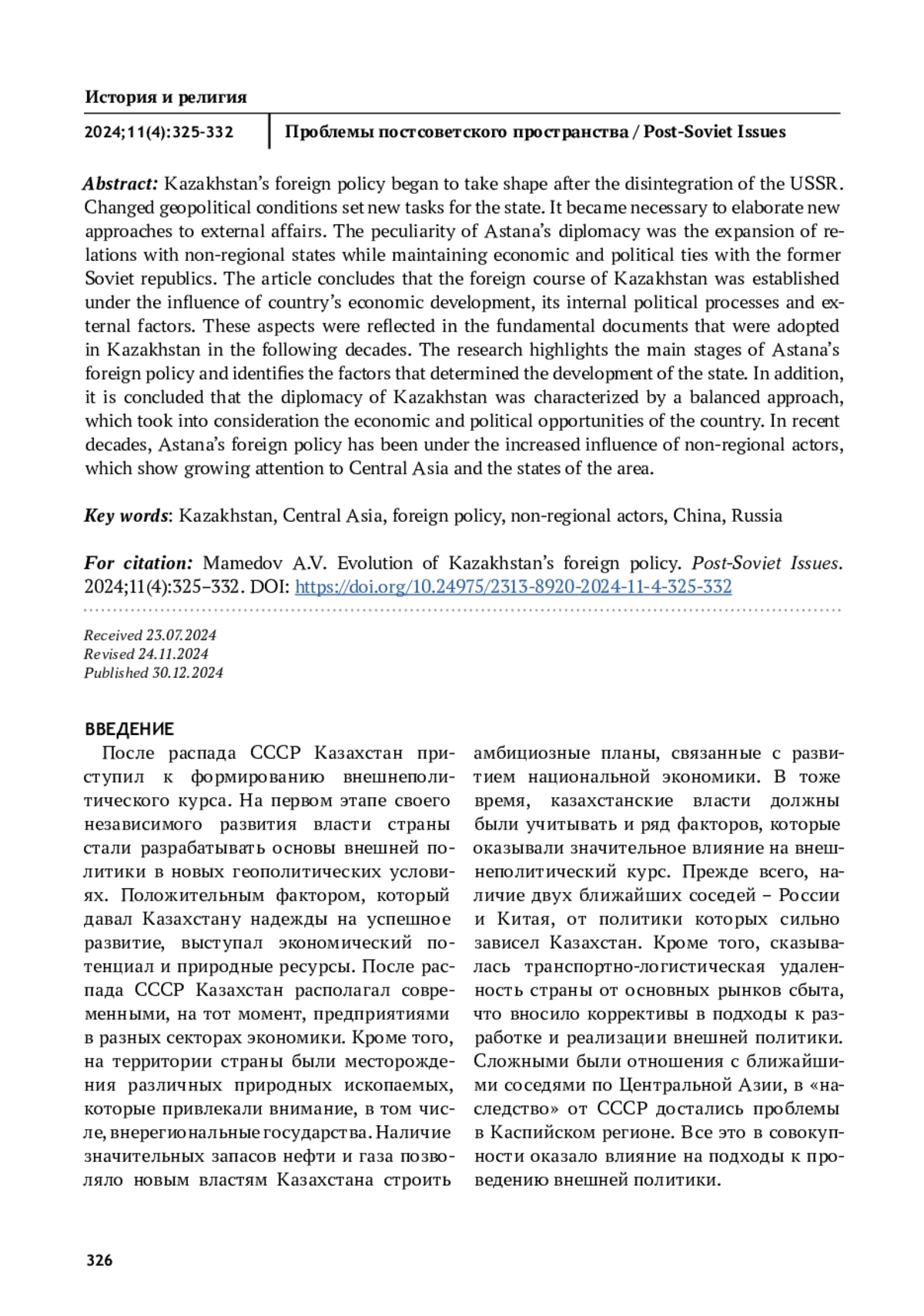 Внешняя политика Казахстана начала формироваться после распада СССР. Новые геополитические условия поставили перед государством новые задачи. Возникла необходимость осмысления и выработки новых подходов к реализации внешнеполитического курса. Особенностью внешней политики Казахстана стало расширение отношений с внерегиональными государствами при сохранении экономических и политических отношений с бывшими советскими республиками. В статье сделан вывод, что внешнеполитический курс складывался под влиянием экономического развития Казахстана, внутриполитических процессов, а также под сильным воздействием внешнего фактора. Это нашло отражение в основополагающих документах, которые были приняты в Казахстане в последующие десятилетия. В статье выявлены основные этапы внешней политики Казахстана, определены факторы, определившие развитие государства. Сделан вывод, что политика Казахстана носила сбалансированный характер, который отражал экономические и политические возможности страны. В последние десятилетия внешняя политика Казахстана находилась под возросшим влиянием внерегиональных акторов, которые проявляют повышенное внимание к Центральной Азии и центральноазиатским государствам.