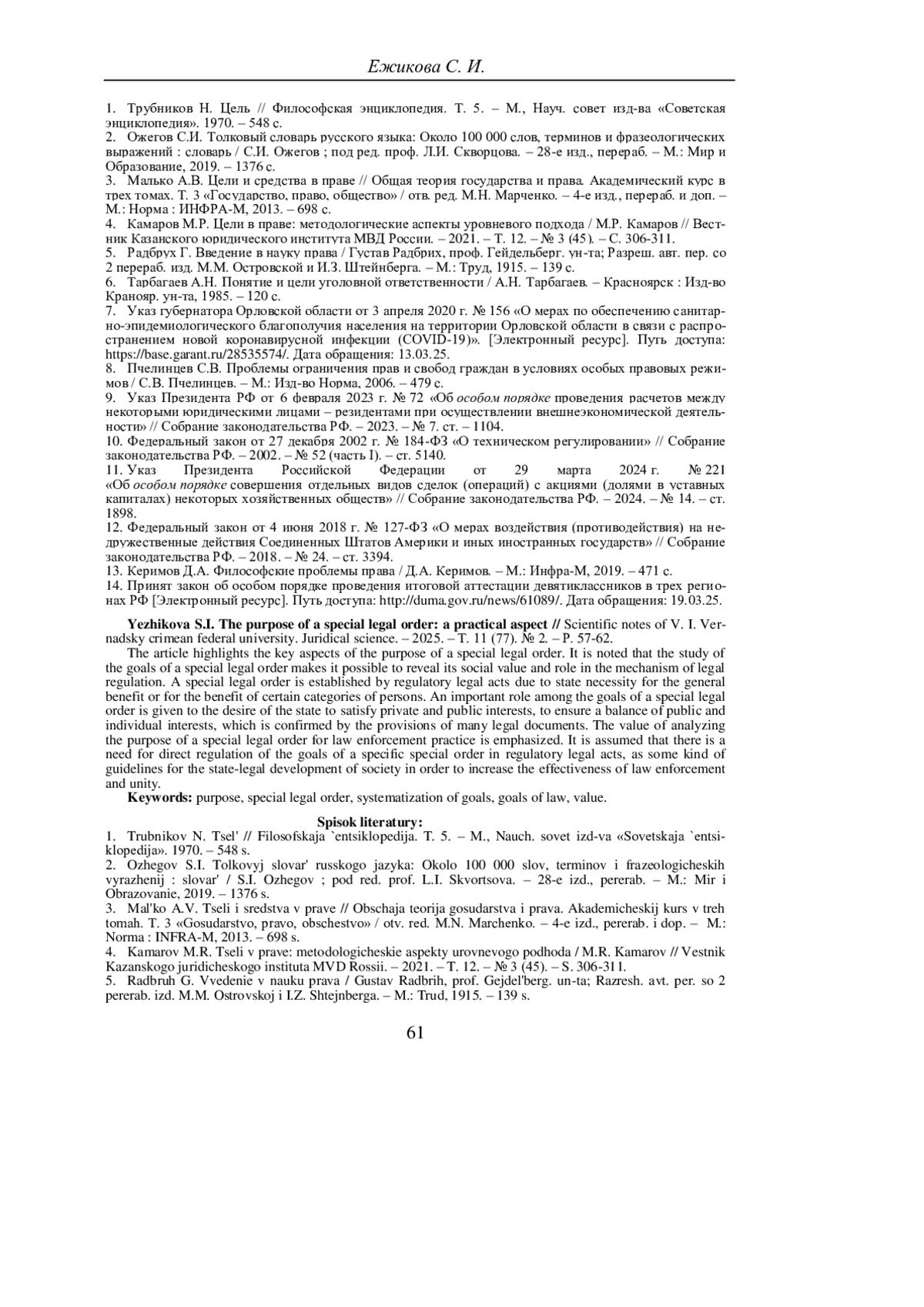 В статье освещаются ключевые аспекты целевого назначения особого правового порядка. Отмечается, что изучение целей особого правового порядка позволяет раскрыть его социальную ценность и роль в механизме правового регулирования. Особый правовой порядок устанавливается нормативными правовыми актами вследствие государственной необходимости для общей пользы или для пользы отдельных категорий лиц. Важное значение среди целей особого правового порядка отводится стремлению государства удовлетворить частные и публичные интересы, обеспечить баланс интересов общественных и индивидуальных, что подтверждается положениями многих юридических документов. Подчеркивается ценность анализа целевого назначения особого правового порядка для правоприменительной практики. Презюмируется необходимость непосредственной регламентации целей конкретного особого порядка в нормативных правовых актах, как неких ориентиров государственно-правового развития общества для повышения эффективности правоприменения и единства толкования.