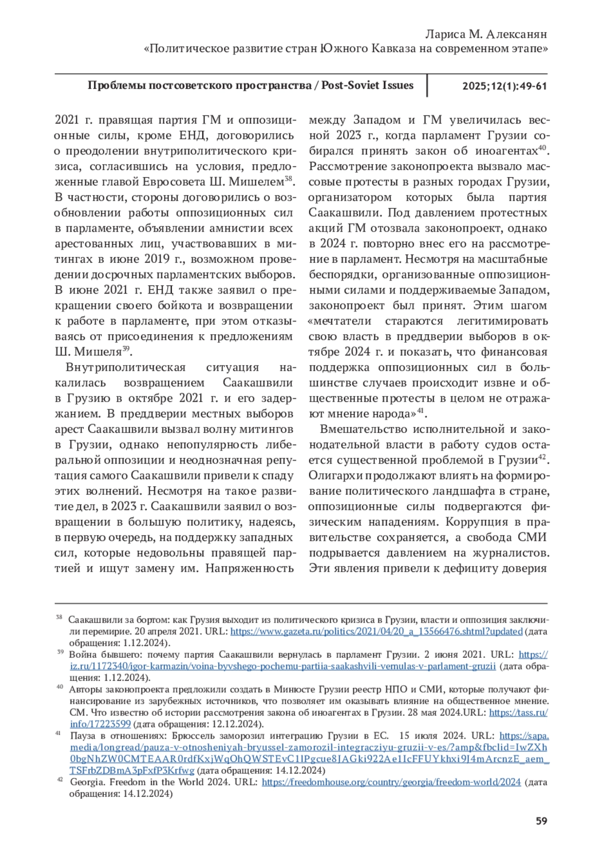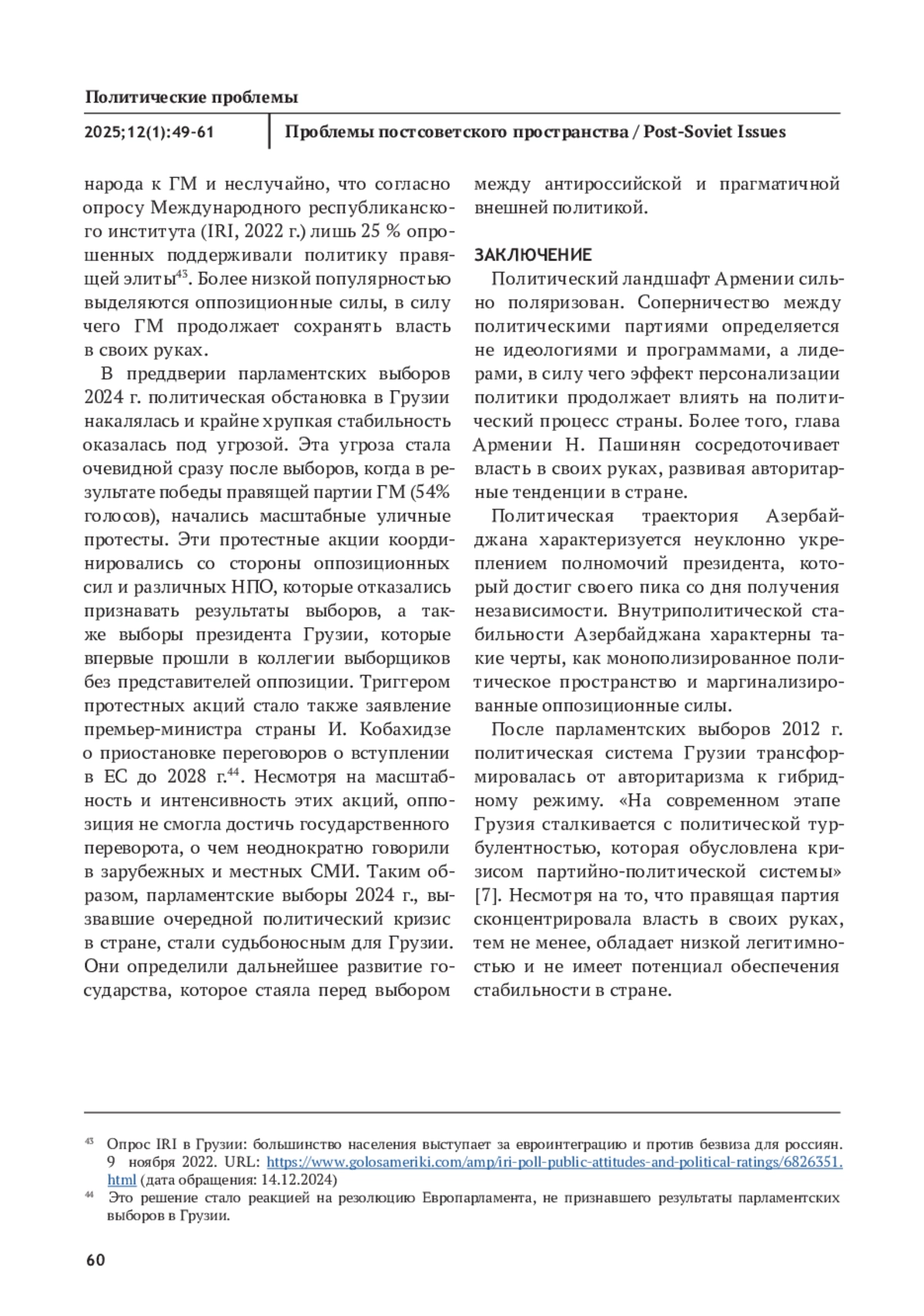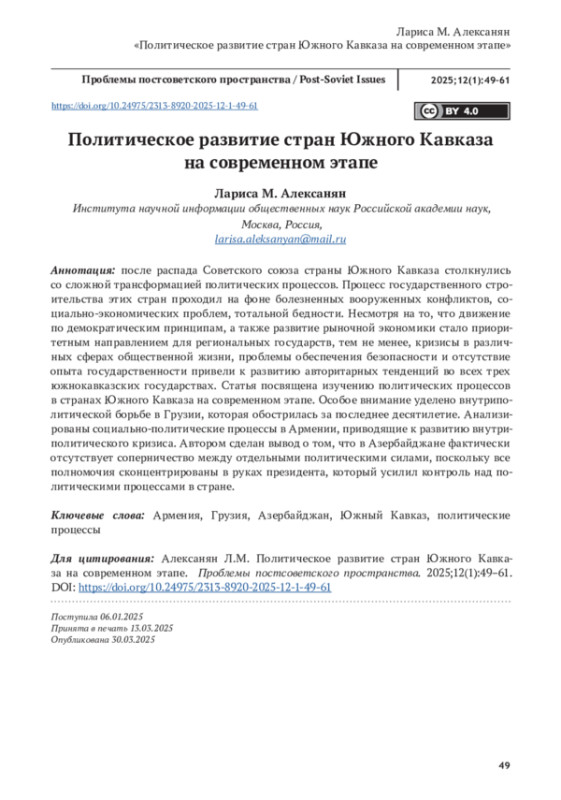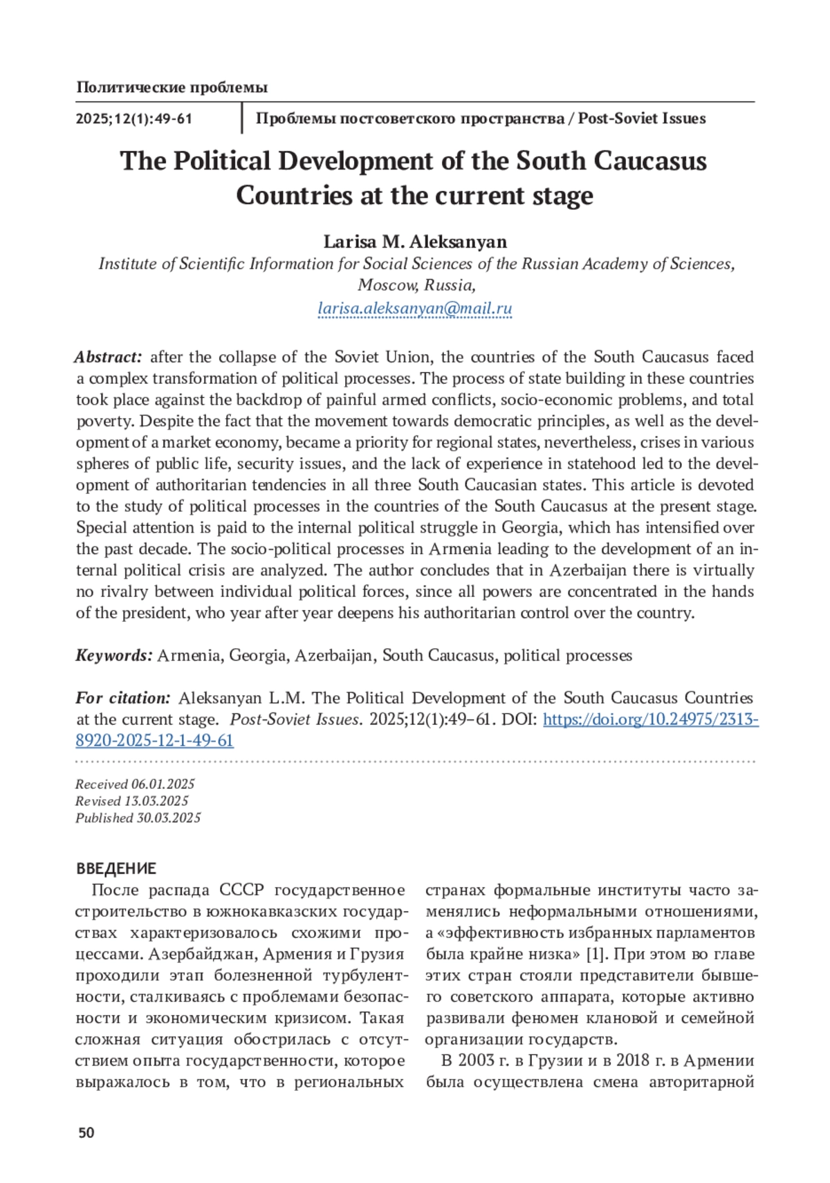 После распада Советского союза страны Южного Кавказа столкнулись со сложной трансформацией политических процессов. Процесс государственного строительства этих стран проходил на фоне болезненных вооруженных конфликтов, социально-экономических проблем, тотальной бедности. Несмотря на то, что движение по демократическим принципам, а также развитие рыночной экономики стало приоритетным направлением для региональных государств, тем не менее, кризисы в различных сферах общественной жизни, проблемы обеспечения безопасности и отсутствие опыта государственности привели к развитию авторитарных тенденций во всех трех южнокавказских государствах. Cтатья посвящена изучению политических процессов в странах Южного Кавказа на современном этапе. Особое внимание уделено внутриполитической борьбе в Грузии, которая обострилась за последнее десятилетие. Анализированы социально-политические процессы в Армении, приводящие к развитию внутриполитического кризиса. Автором сделан вывод о том, что в Азербайджане фактически отсутствует соперничество между отдельными политическими силами, поскольку все полномочия сконцентрированы в руках президента, который усилил контроль над политическими процессами в стране.