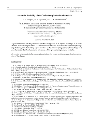 14. Аверкиев В. В., Долгов А. Н., Ляпидевский В. К., Савёлов А. С., Салахутдинов Г. Х. // Физика плазмы. 1992. Т. 18. № 6. С. 724.
