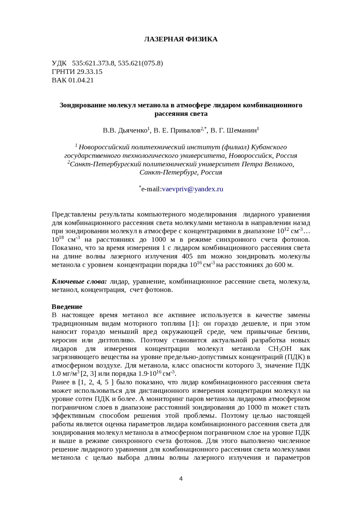 Введение В настоящее время метанол все активнее используется в качестве замены традиционным видам моторного топлива [1]: он гораздо дешевле, и при этом наносит гораздо меньший вред окружающей среде, чем привычные бензин, керосин или дизтопливо. Поэтому становится актуальной разработка новых лидаров для измерения концентрации молекул метанола CH3OH как загрязняющего вещества на уровне предельно-допустимых концентраций (ПДК) в атмосферном воздухе. Для метанола, класс опасности которого 3, значение ПДК 1.0 мг/м3 [2, 3] или порядка 1.9·1016 см-3.
