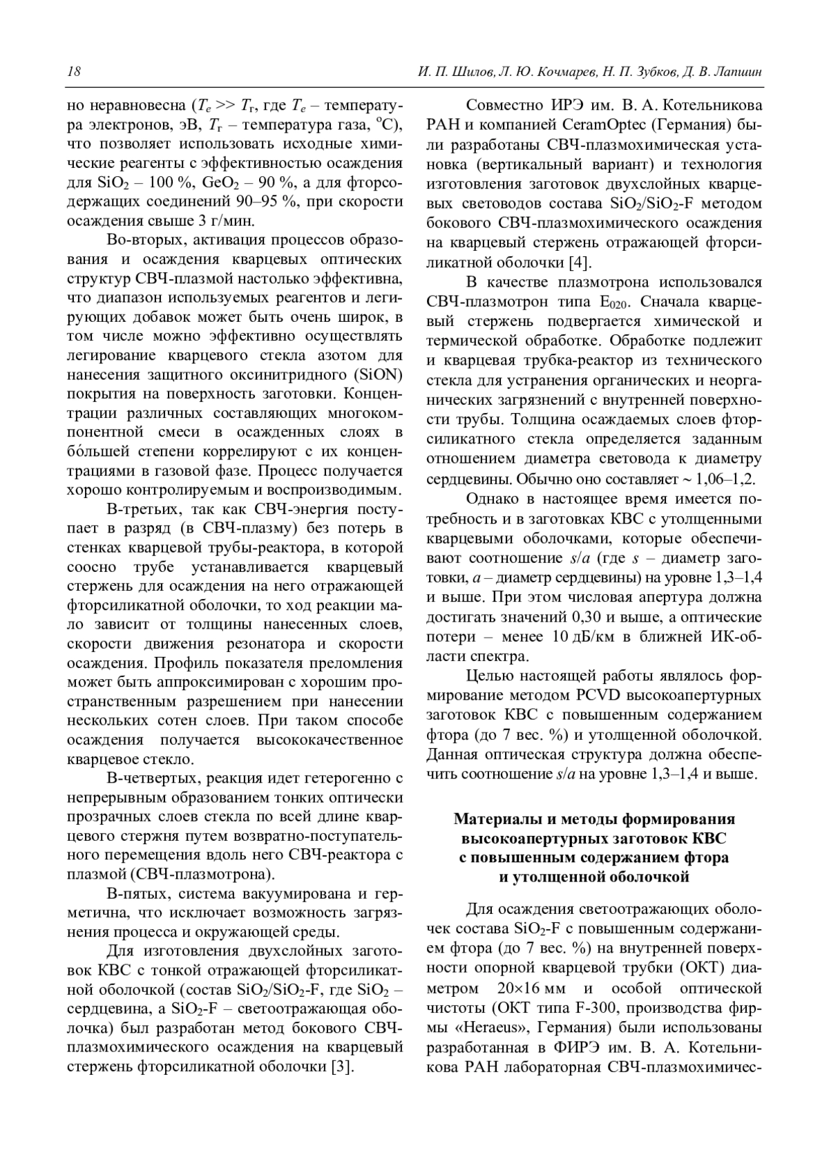 Приведены результаты экспериментальных исследований по получению высокоапертурных заготовок кварцевых волоконных световодов с повышенным содержанием фтора (до 7 вес. %) и утолщенной оболочкой на основе кварцевого стекла, легированного фтором, при помощи неизотермической плазмы резонансного локального СВЧ-разряда (PCVD-метод). Достигнуты высокие скорости осаждения слоев кварцевого стекла, легированного фтором (вплоть до 3 мкм/мин), и соотношения s/a (где s – диаметр заготовки, a – диаметр сердцевины) на уровне 1,3–1,4 и выше.